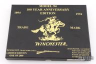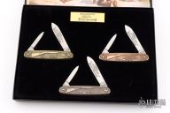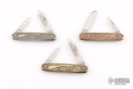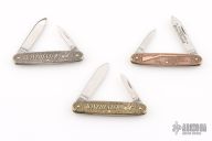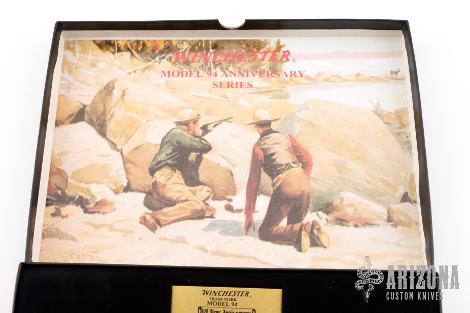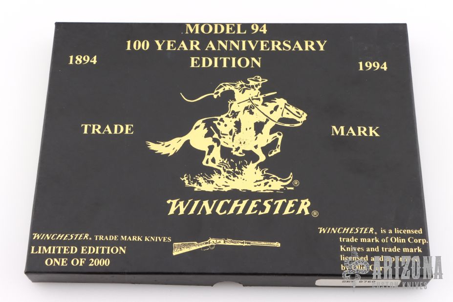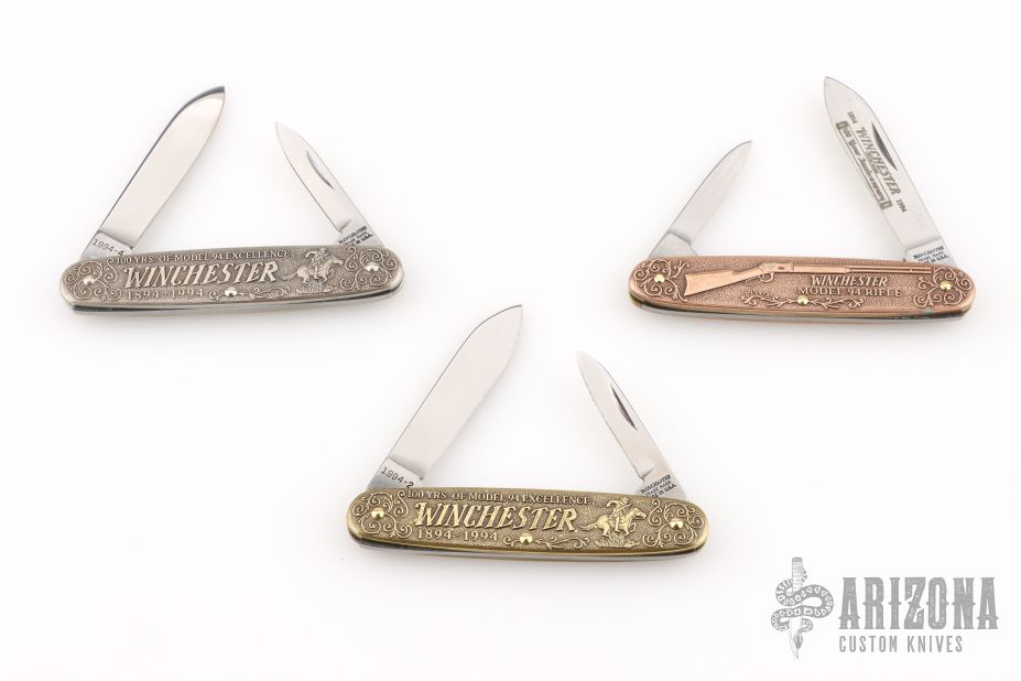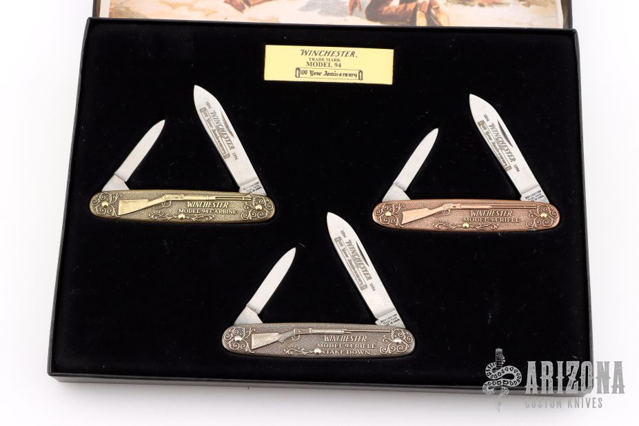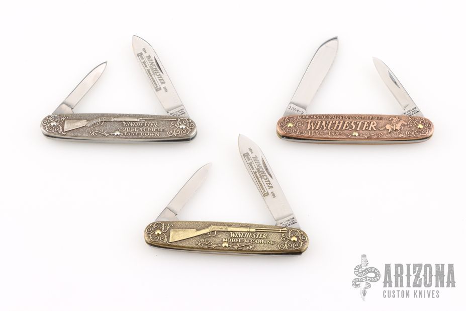 Made in 1994 in the USA to commemorate the 100th Anniversary of the Winchester Model 94 Carbine. All three knives feature a 2 3/8″ Drop Point blade, and a 1 1/2″ Pen blade. All three knives measure 3 1/2″ closed. The handle materials are Copper, Nickel Silver, and Brass frames. One of 2,000. Serial number 760.