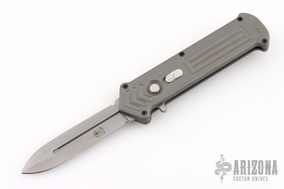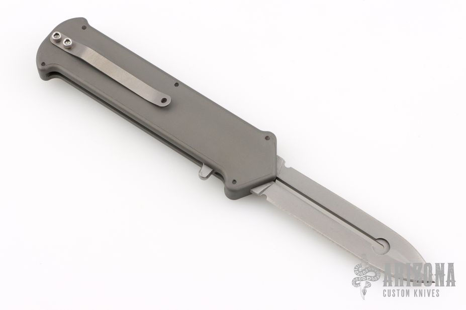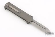 This Cupid #20104 by Rob Dalton features a bead blasted double edged blade. The handle is comprised of a machined and gray anodized aluminum frame with bead blasted, tip down pocket clip. This one has a safety, which is the only one we have ever seen. Very Rare. Comes in a small pelican hard case. Excellent condition.