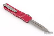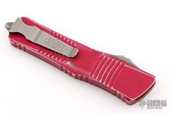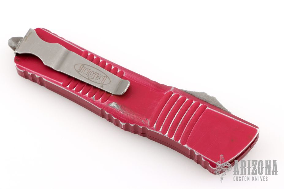 This Combat Troodon OTF automatic features a stonewash finished D/E blade with a fully serrated edge. The handle has a distressed red aluminum frame with stainless steel clip. Glass breaker. Serial number 27838 and dated 04/2020. Comes with original box and papers. Has scuffs and scratches throughout, good condition otherwise.