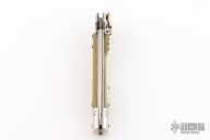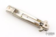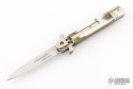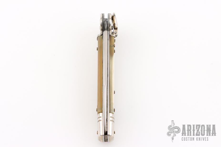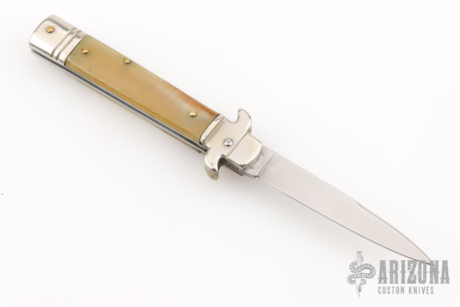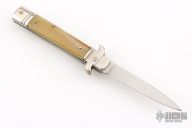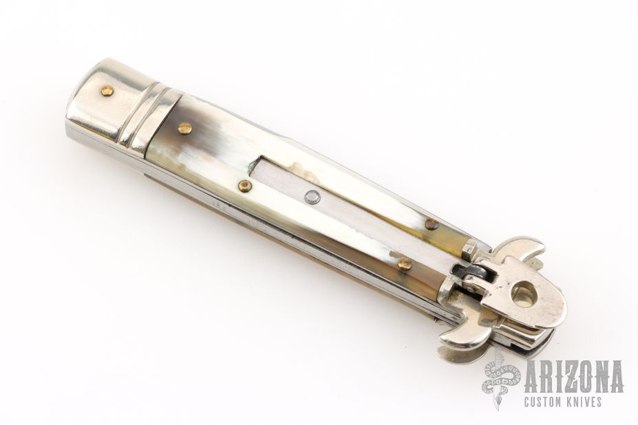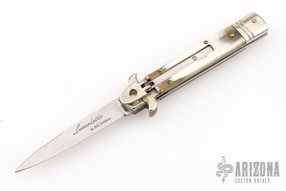 This Leverletto Lever Lock Auto has a mirror polished stainless steel spear point blade. Handle has buffalo horn scales, fluted nickel silver front and rear bolsters, stainless steel liners and back spacer, and nickel silver lock release button. Has some light scratches, otherwise excellent condition.