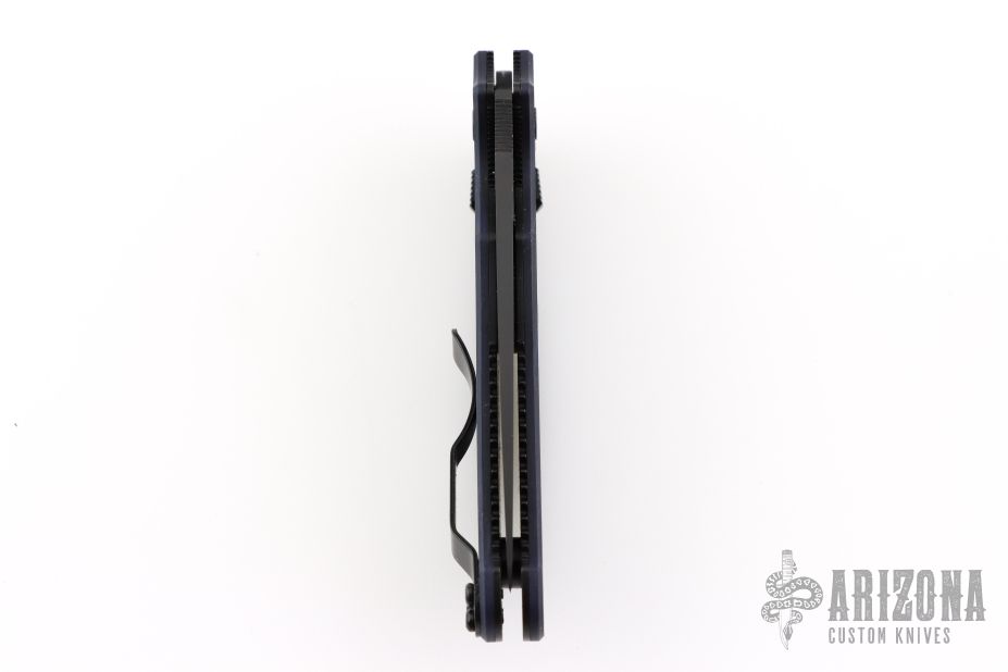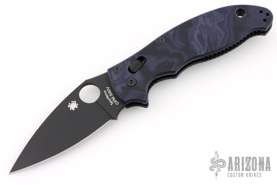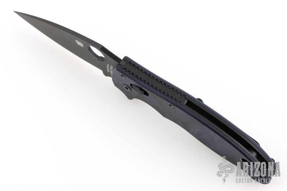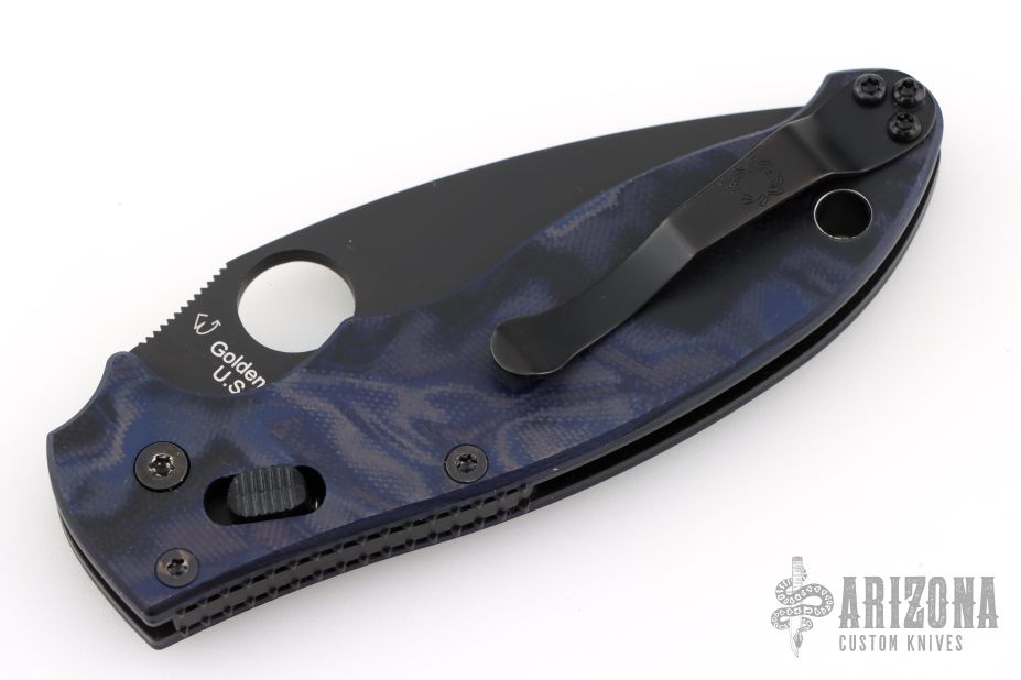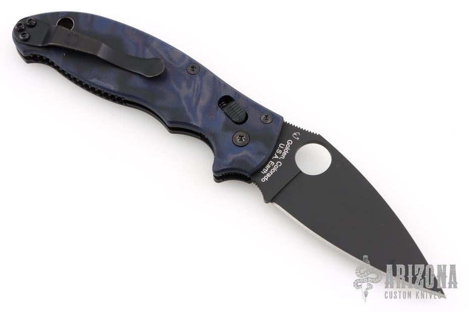 This Spyderco Manix 2 is from a sprint run, it has a black blade, thumbhole and notched thumbrest. The handle has black/purple/blue G-10 scales, black stainless steel liners and backspacer, 4-way reversible black stainless steel clip. Includes original box and papers. The scales have been dyed, and there is some marring on the hardware, great overall condition.