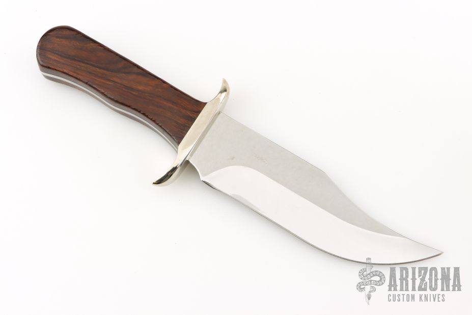 This custom Bowie by Buck features a mirror polished clip point blade with false top edge, .177" blade stock and 1.997" blade depth, full tang construction. The handle has a nickel silver guard, ironwood scales with a Boone and Crockett Club Medallion inlay. Comes with a wooden display box and COA #122 of 250. Has a couple light scratches, otherwise excellent condition.
