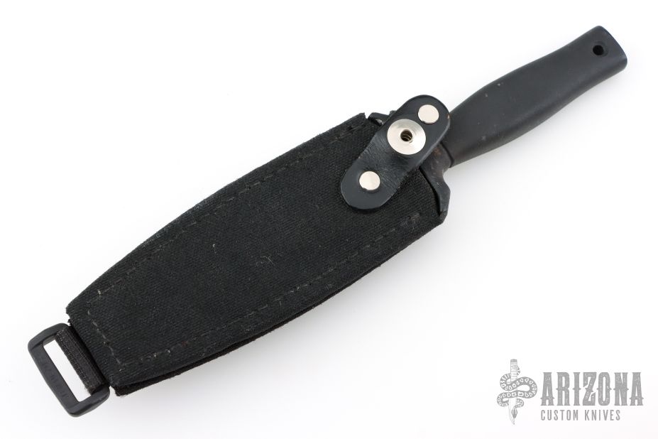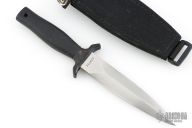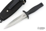 This Mark 1 dagger by Gerber is double-edged and hand rub satin finished, .241" blade stock and .941" blade depth, hidden tang construction. Black coated aluminum handle. Comes with black nylon sheath with boot clip. #J2378S. Has some scuffs, scratches, and patina. Good condition.