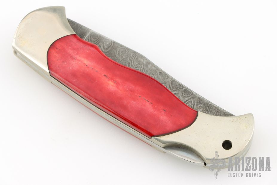 This lockback folder by Boker features a Damascus blade. The handle has nickel silver frame, bone inlays, and a stainless steel backspacer. Comes with original wood box and papers. Has a few light scratches, otherwise excellent condition.