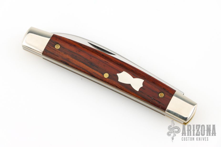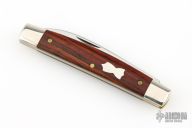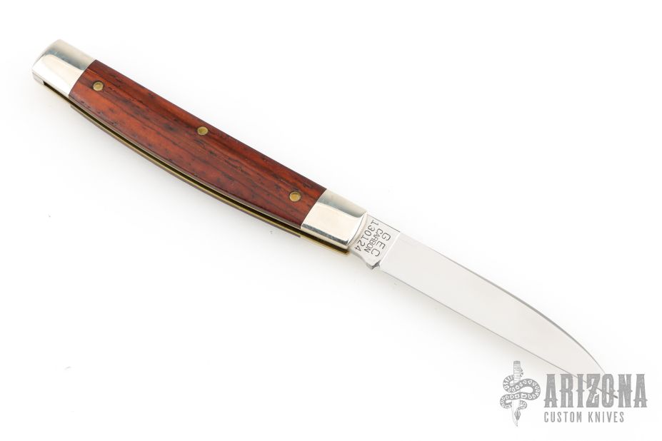 This knife by Great Eastern Cutlery features a satin finished wharnecliffe blade with a nail nick.  The handle has nickel silver bolsters with cocobolo covers over brass liners.  Steel backspring.  Comes with original packaging. Excellent condition.