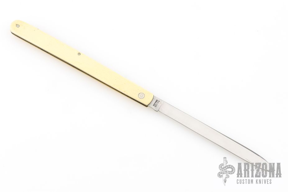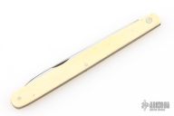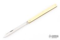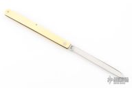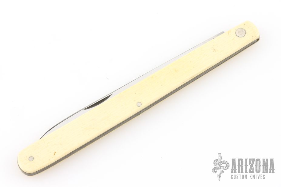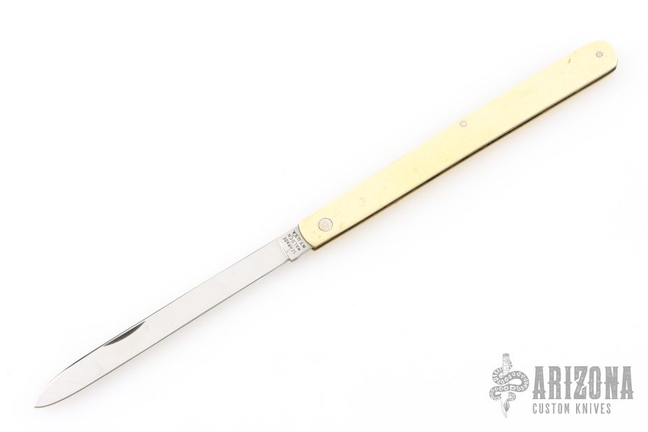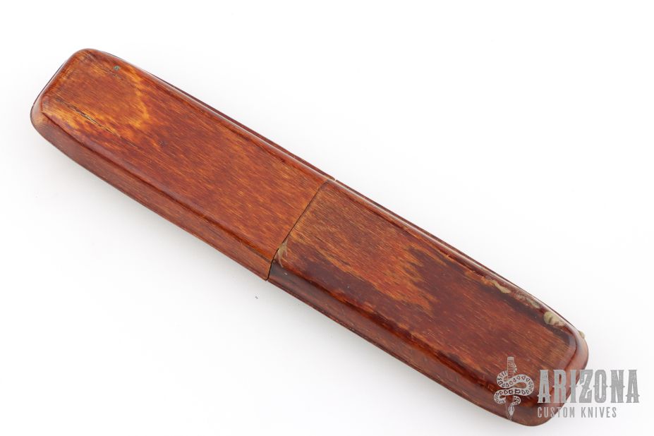 This Melon Tester features a satin finished blade with nail nick. The handle has composite (bakelite?) scales, brass liners and stainless spring. Comes in a Puma straight razor case. Has some scuffs and scratches, great overall condition.