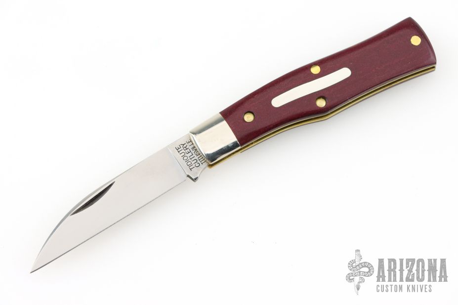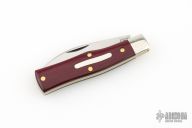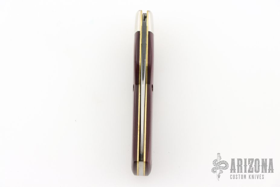This slipjoint features a satin finished blade with a single nail nick. The handle has nickle silver bolsters, red stone covers and brass liners. Includes the original tube and packaging. Excellent Condition.