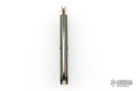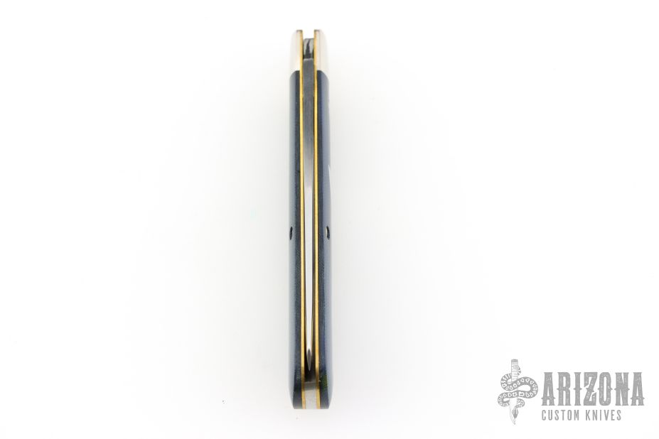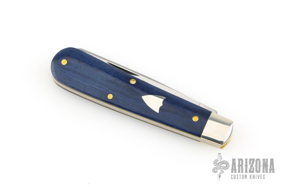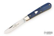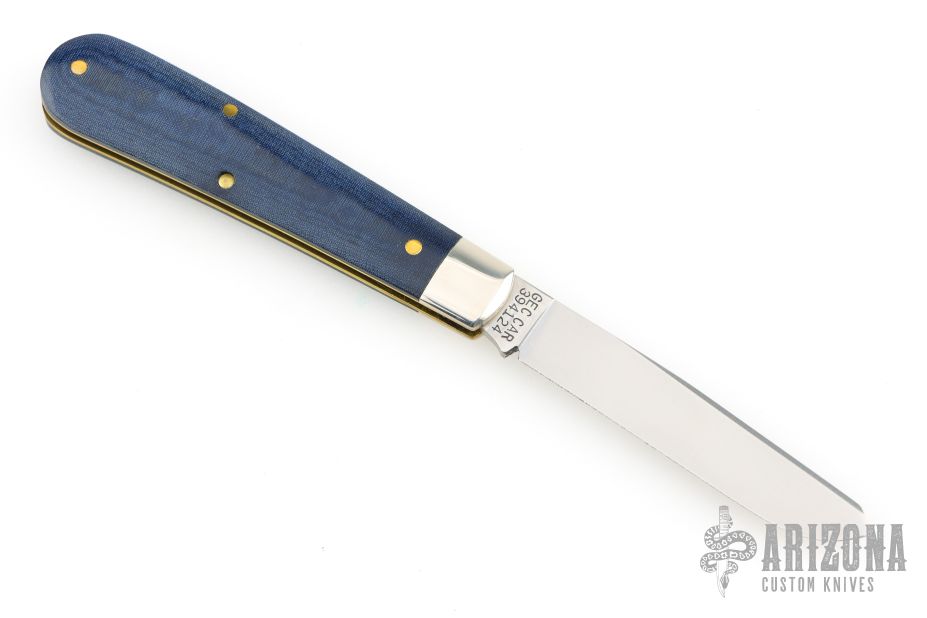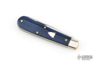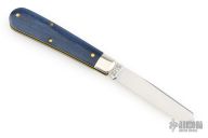 This knife by Great Eastern Cutlery features a satin finished blade with nail nick. The handle has nickel silver bolsters that are pinched, brass liners, and blue linen micarta covers. Has half-stop. Comes with original tube and wax paper. Excellent condition.