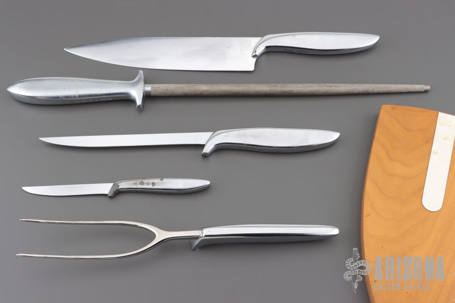 Gerber Vintage Kitchen Set - French, Durendal, Pixie w/ Fork, Steel & Wooden Display Shield