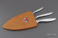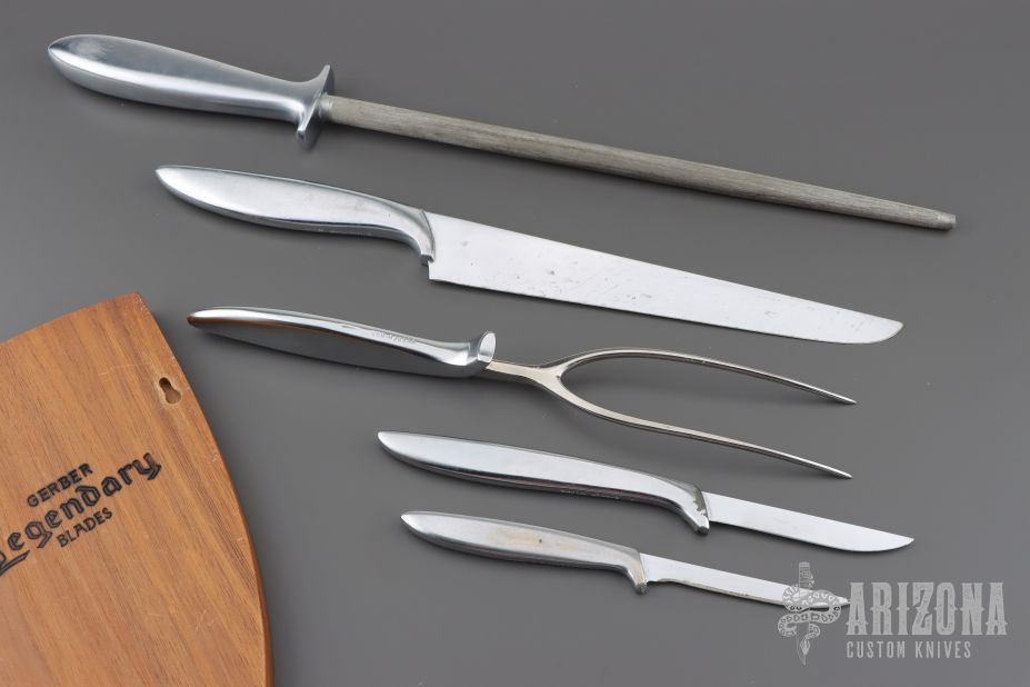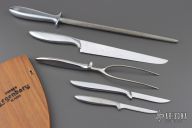 This set includes a carving fork, sharpening steel, and a wall-mountable wooden display/holder.