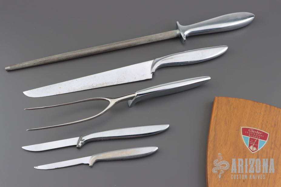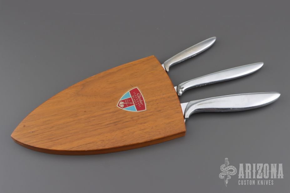Miming steak knife, hidden tang straight back blade, .044" blade stock, .441" blade depth, coated aluminum handle. 3" Blade length, 8.375" Overall length, weighs 3.7oz. Has some scuffs and scratches, good condition for its age.