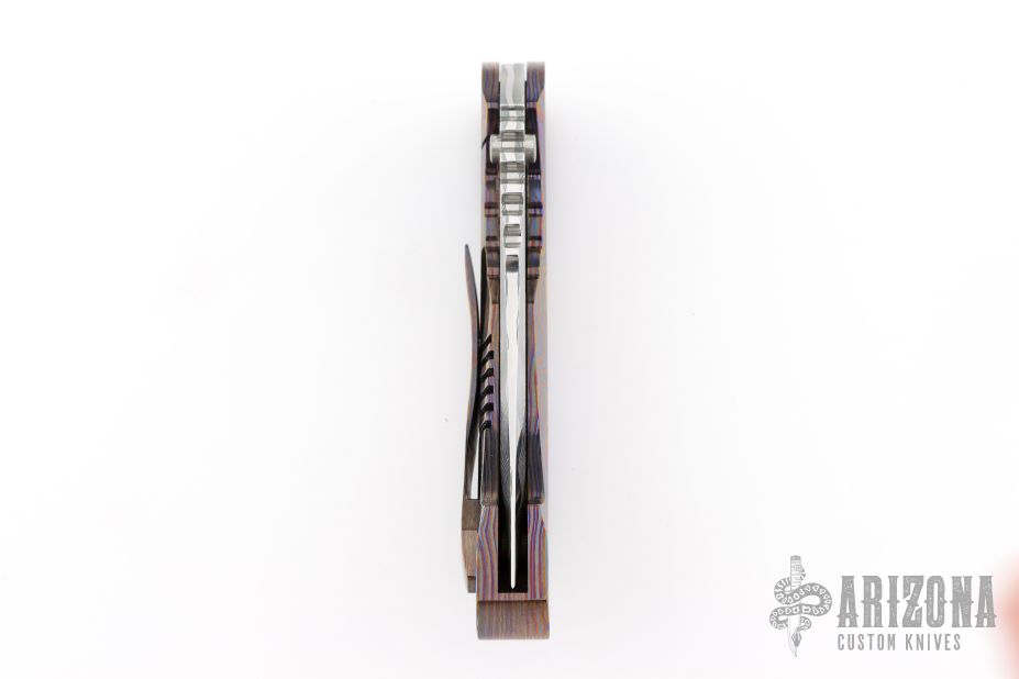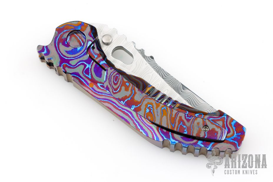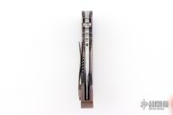 This Sole-Authorship Integral framelock folder from Dalibor Bergam features a polished Sole-Authorship San Mai Damascus blade with thumb hole and notched thumbrest. The handle has a sole-authorship black timascus frame with a matching tip up clip. Nice detent, blade seating and lock up. Comes with leather pouch. Excellent condition.