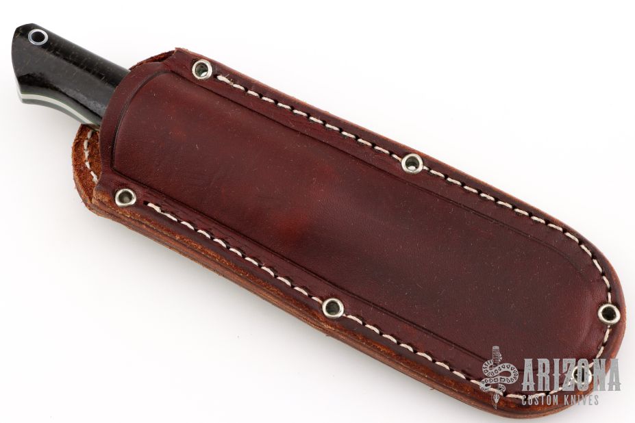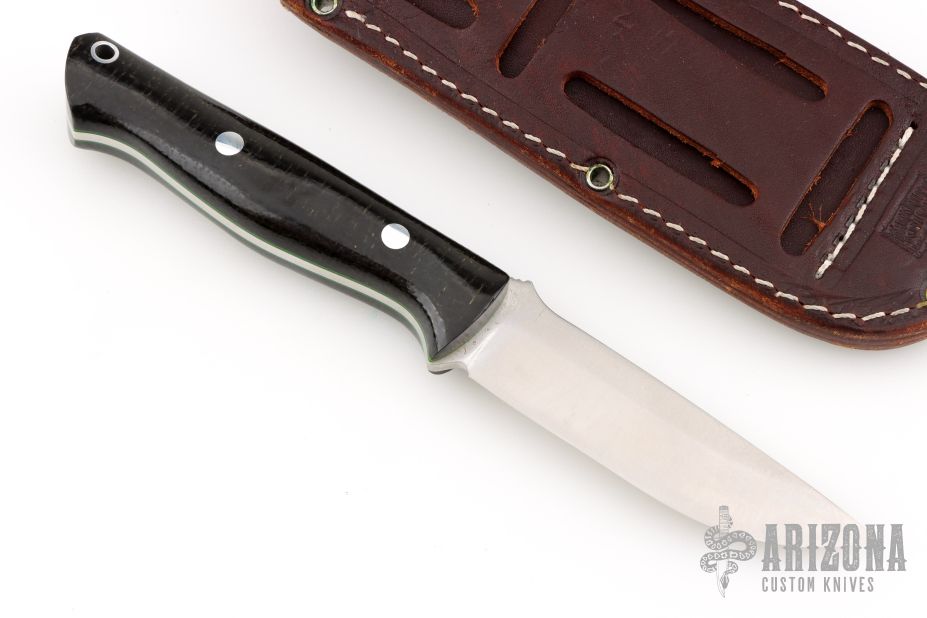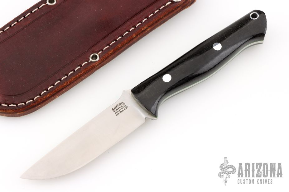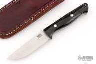 This Gunny Hunter LT by Bark River Knives features a satin finished blade with .129" blade stock and .975" blade depth, full tang construction. The handle has smooth black burlap scales with alu pins, lime colored liners, and lanyard hole. Comes with original box, and brown leather sheath. Has a couple light scuffs, otherwise Excellent condition.