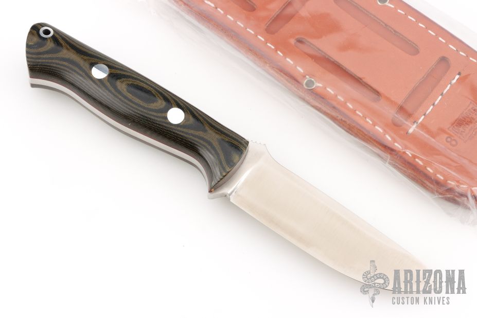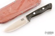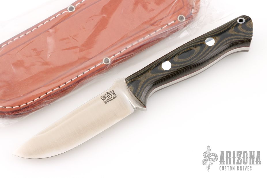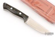 This Bravo-1 by Bark River Knives features a satin finished blade with notched thumbrest, .215" blade stock and 1.349" blade depth, full tang construction. The handle has black/green canvas micarta scales with lanyard hole, red liner, and aluminum pins. Comes with a leather sheath and original box. Has a couple light scuffs and scratches, excellent condition.