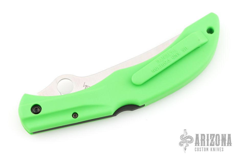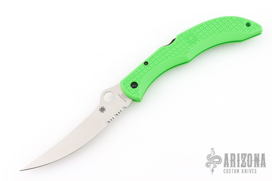 This Spyderco Catcherman eatures a satin finished upswept partially serrated blade with thumbhole, .067" blade stock. The handle is green FRN with integral tip up clip, lanyard hole at the butt. Nice lockup and blade seating. Excellent condition. Comes with original box and papers.