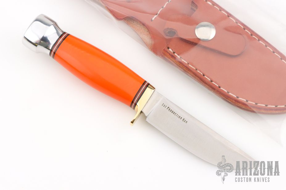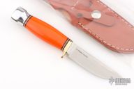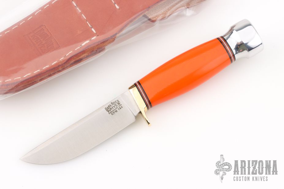 This Mini Manitou by Bark River features a satin finished blade with false top edge, .151" blade stock and .885" blade depth, hidden tang construction. The handle has a polished brass guard and aluminum butt, orange G10 grip with red/brass/black spacers. Comes with original brown leather sheath and box. Excellent condition.