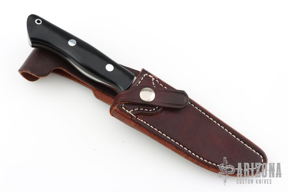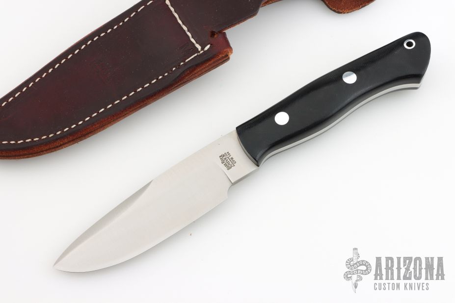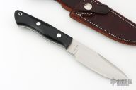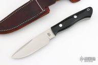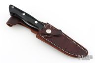 This Michigan Hunter from Bark River Knives features a satin finish drop point blade, .180" blade stock and 1.289" blade depth, full tang construction. The handle has black canvas micarta scales with stainless pins and lanyard hole. Comes with a brown leather sheath and original box. Has scuffs and scratches, good condition otherwise.