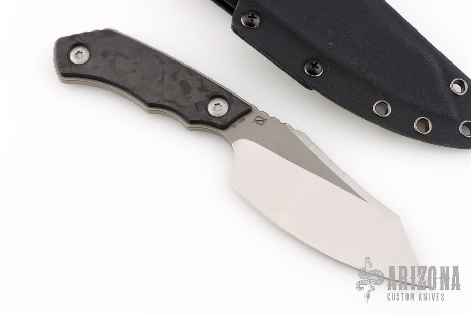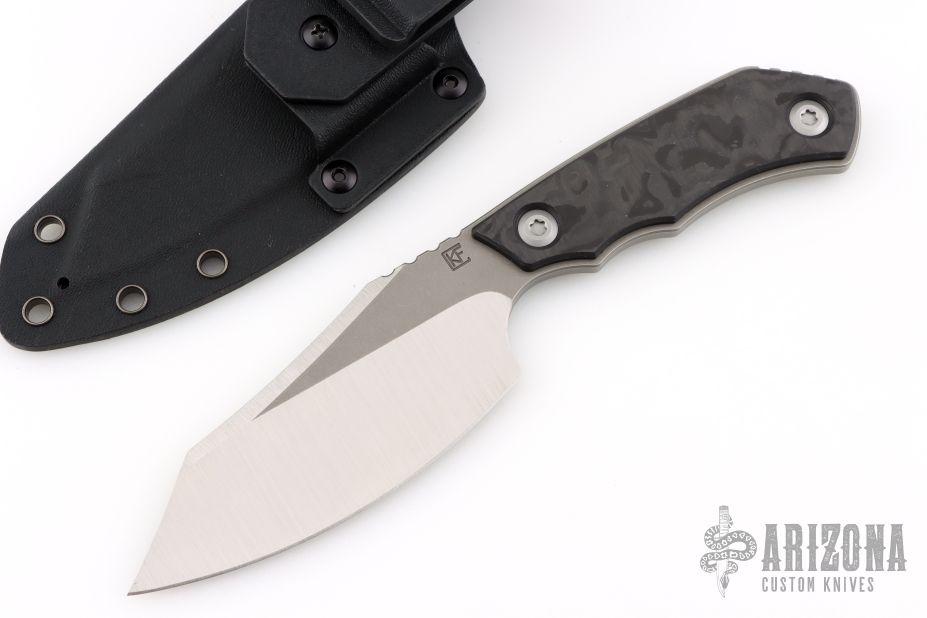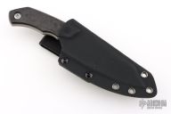 This Evo Fixed Blade by CKF is a Jon Sorensen design, it features a satin finished blade with notched thumbrest, .189" blade depth and 1.833" blade depth, full tang construction. The handle has marble carbon fiber scales. Comes with kydex sheath, Velcro case, extra hardware and COA #118. Excellent condition.
