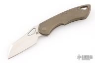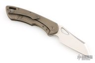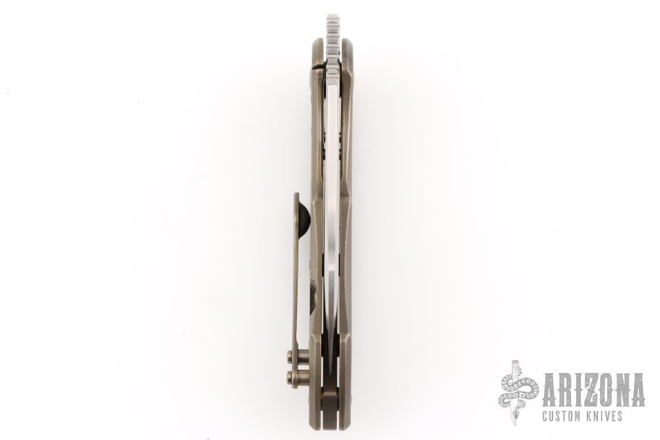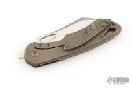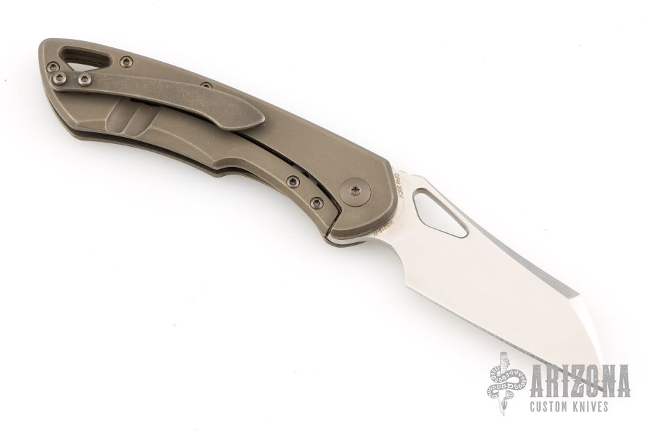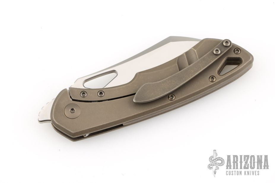 This Whippersnapper from Olamic Cutlery features a satin finished blade, thumbhole, notched thumbrest and front flipper. The handle has a Texwash Earth Finished titanium frame, titanium pocket clip is positioned for tip up carry, floating titanium backspacer.  Comes with original box and COA dated 3/13/2020 and #218-W. Excellent condition.