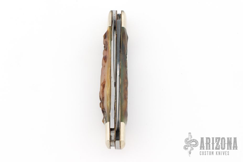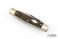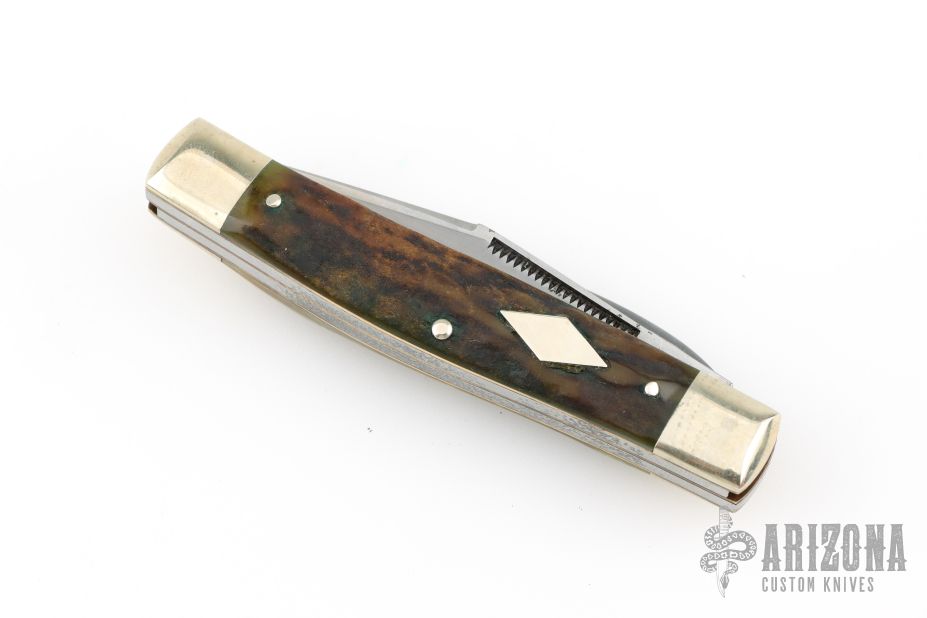 This knife from Bull Dog Brand Knives features etched and polished blades with nail nicks. The handle is comprised of nickel silver bolsters and cap, stag covers over brass liners and stainless steel backsprings. Has a few light scratches, otheriwse great condition.