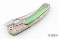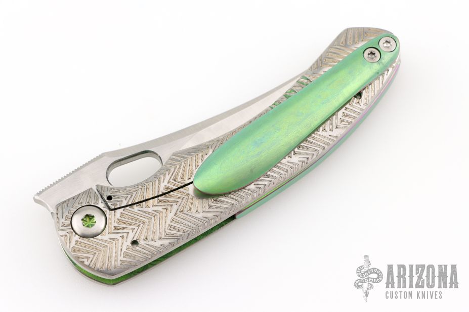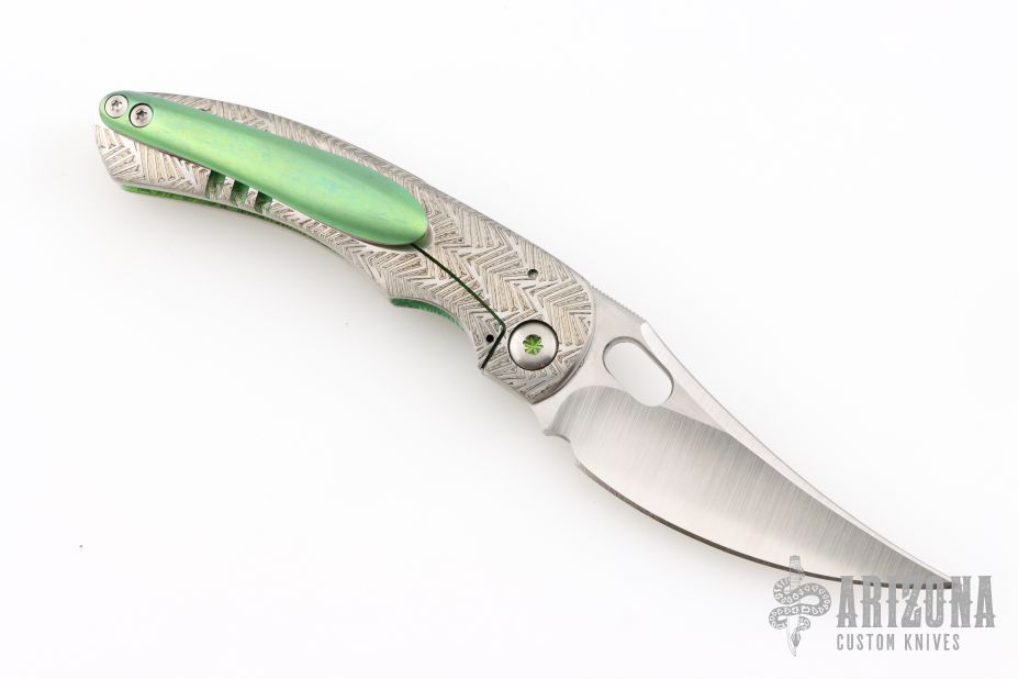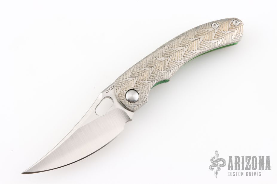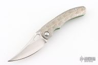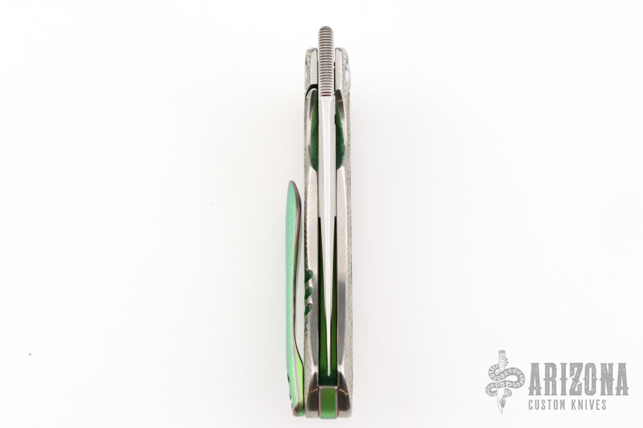 This Mini P by Sean O'Connell features a satin finished blade with notched thumbrest and thumbhole. The handle has an anodized and laser engraved titanium frame with an anodized titanium backspacer and tip up clip. Nice detent, lockup and blade seating. Rides on bearings. Comes with a zippered case and COA. Excellent condition.
