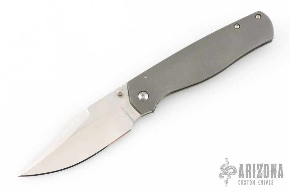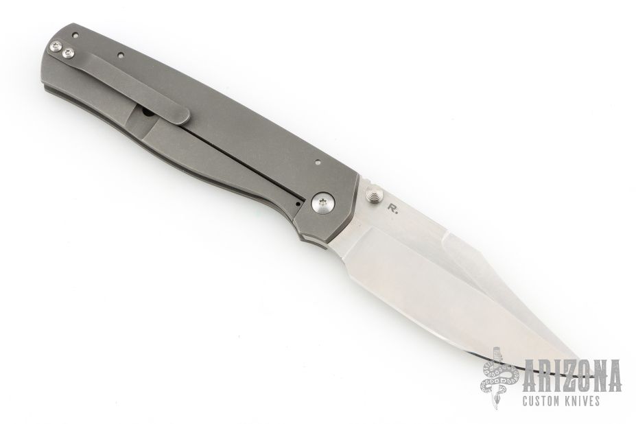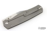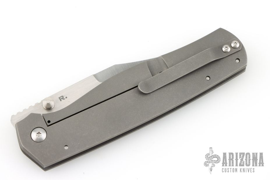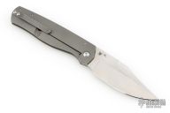 This Albatross Framelock by Ray Laconico features a satin finished blade with dual thumbstuds and notched thumbrest. The handle has a stonewashed titanium frame with matching tip up clip. Nice detent, lockup and blade seating. Comes with a zippered case. Excellent condition.