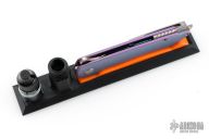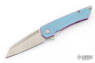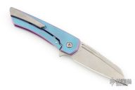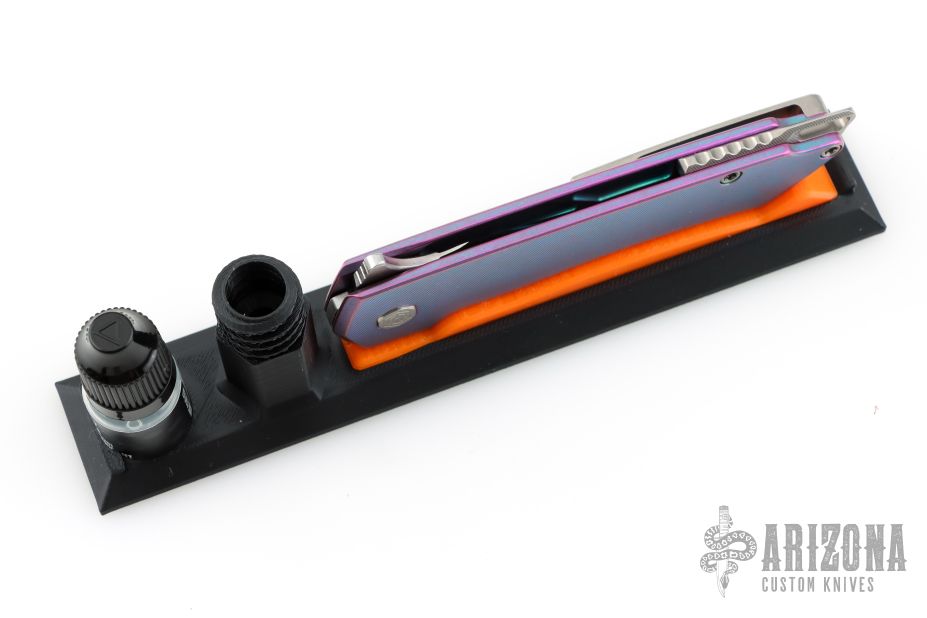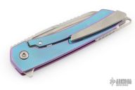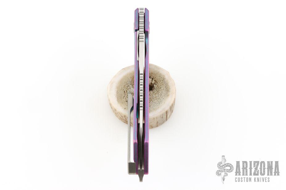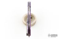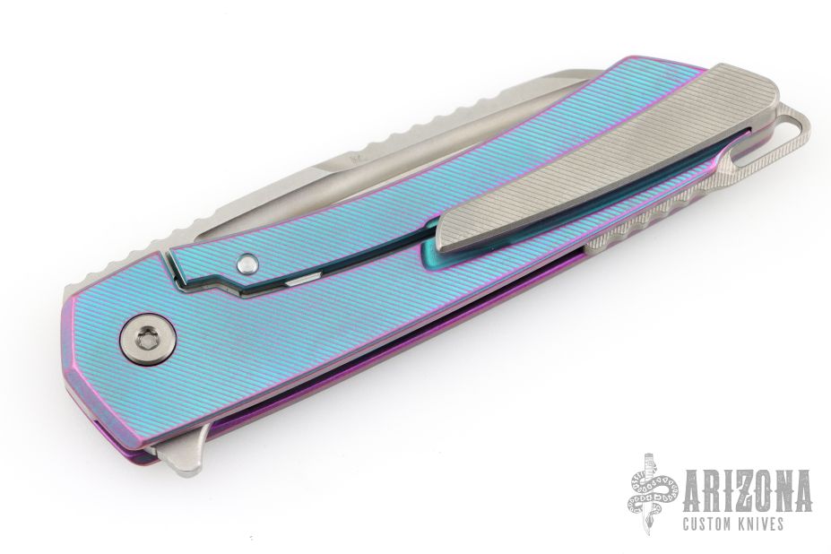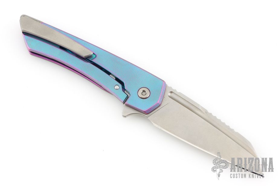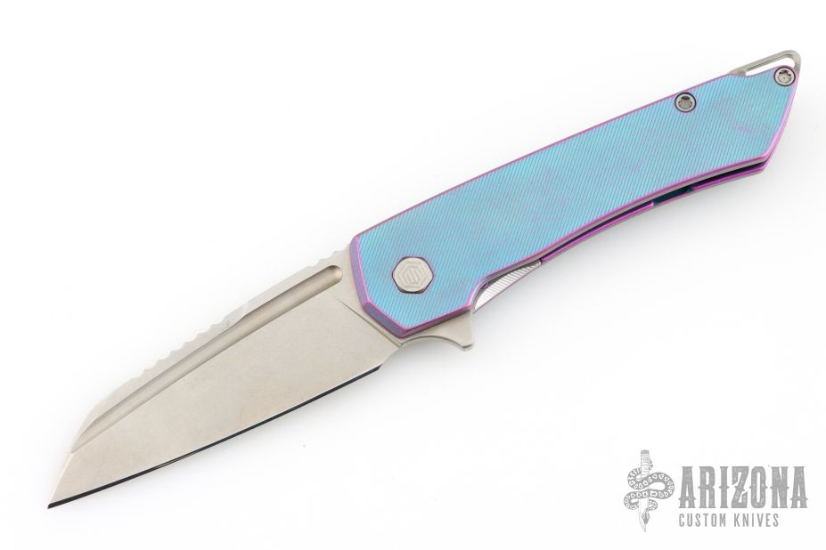 This Mojave by Machine Wise features a stonewashed blade with flipper tab, notched thumbrest, and fullers. The handle is two-tone anodized titanium with a milled pattern. Titanium tip up clip and backspacer. Includes original 3D printed box, tool, lube and card. S/N 173. Excellent condition.