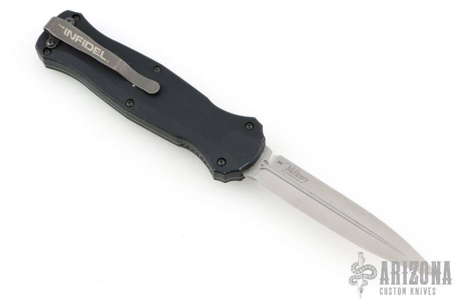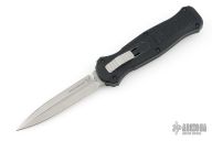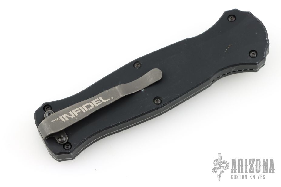 "Introducing an OTF like none-other.. The new Infidel® is rapidly making believers out of many a skeptic. Built for strength and reliability the patent pending double-action mechanics get it done over the long haul. Grab on and you will find the handle grip rock-solid with its patented machined in Presidio® style bi-directional tread pattern, and overall generous sizing for gloved hands. Intuitively pressure the release-slide forward and its spear-point edged steel fires and locks up with a unique three-point retention system with amazingly negligible blade play. Reverse the process and the blade retracts in a rapid blur of motion. The Benchmade Infidel is a special operator’s fantasy come true."