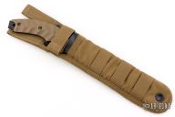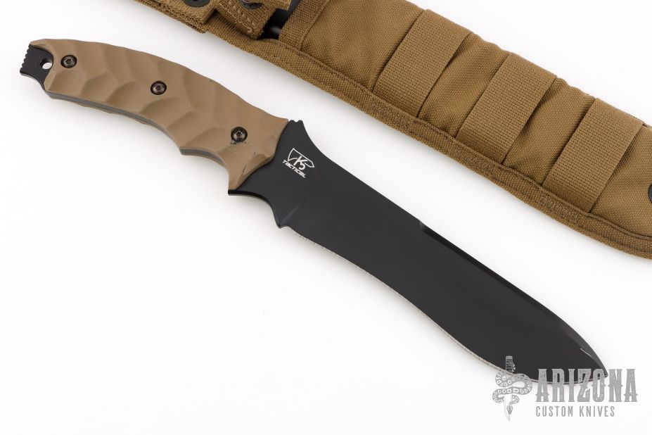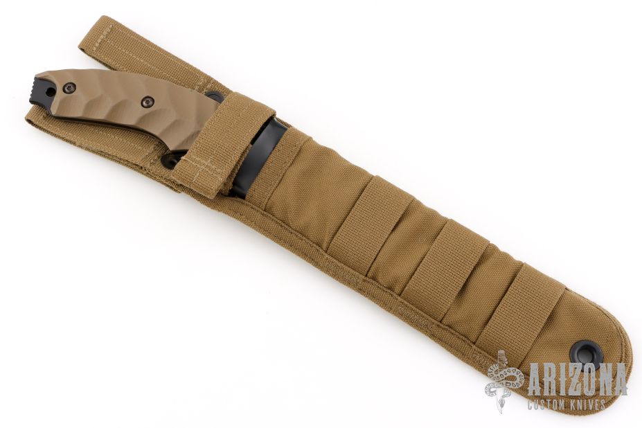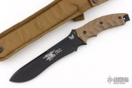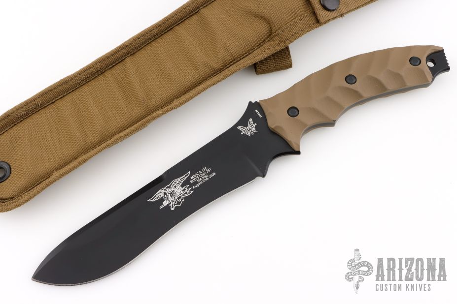 This Marc Lee Tribute Knife by Benchmade features a black recurve blade with false top edge and notched thumbrest, .191" blade stock and 1.575" blade depth, full tang construction. The handle has tan aluminum scales, extended tang with lanyard hole. Comes with tan nylon sheath. Has a scratch on the blade finish, otherwise excellent condition.