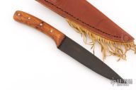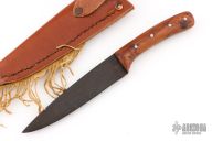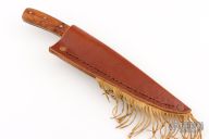 This Frontiersman's Knife by Conan Asmussen features a blackened hand forged blade made from a file, .079" blade stock and 1.325" blade depth, full tang construction. The handle has Pacific Yew wood scales with steel pins. Comes with a brown leather sheath with leather fringe and copper rivets. Excellent condition. Has an intentionally rustic look.