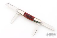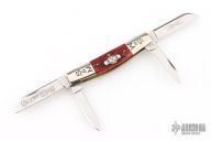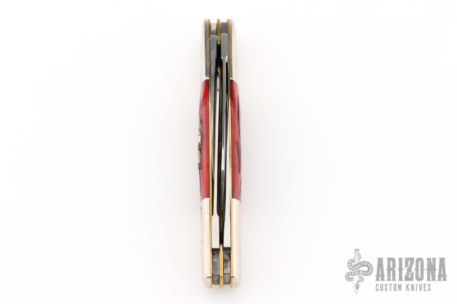 This knife by Schatt & Morgan features mirror polished blades with nail nicks. The handle has nickel silver bolsters, nickel silver shield, brass liners, red jigged bone covers and stainless springs. Excellent condition.