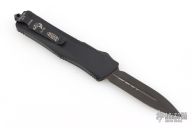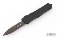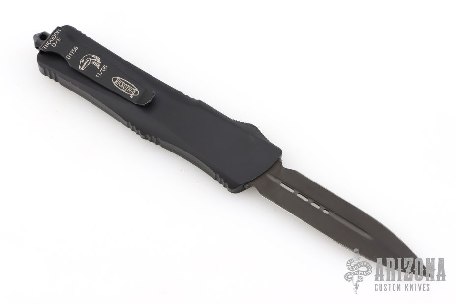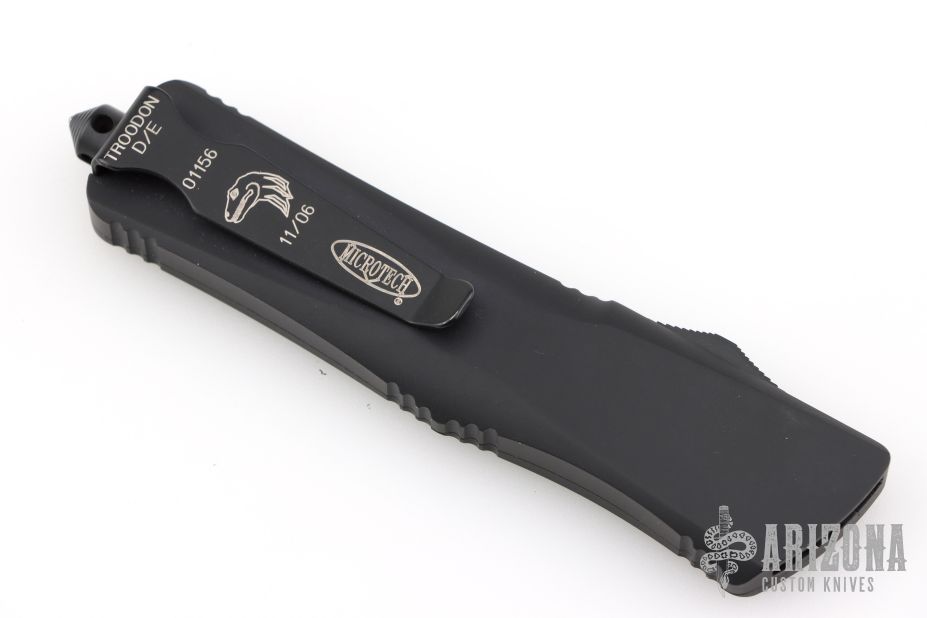 This Troodon by Microtech features a black DLC double edged blade. Black aluminum handle with black hardware and stainless steel clip. Dated 11/06, S/N 01156. Excellent condition. Comes with original box, papers and sheath.