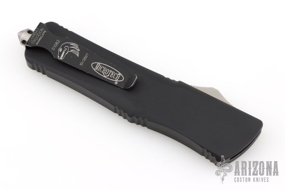 The Combat Troodon frame is of a tapered style, narrow at the front, slightly thicker at the center, then narrowing at the rear, with spaced ribbing on the spine and belly, providing an excellent grip and feel in the hand. The front opening is angled rather than squared. A double action fire/retract out-the-front auto with a spine mounted, ramped trigger, the Combat Troodon operates with extreme speed and smoothness. Dated 10/2007 S/N 01082. Comes with original box, sheath and papers. Excellent condition.
