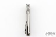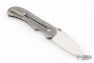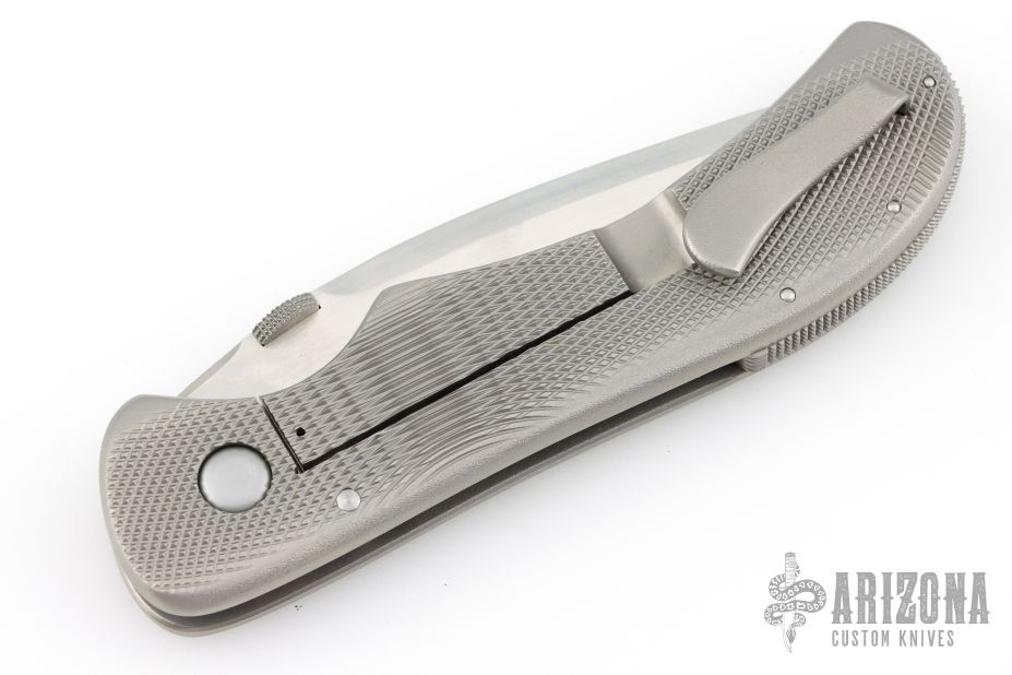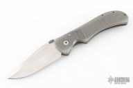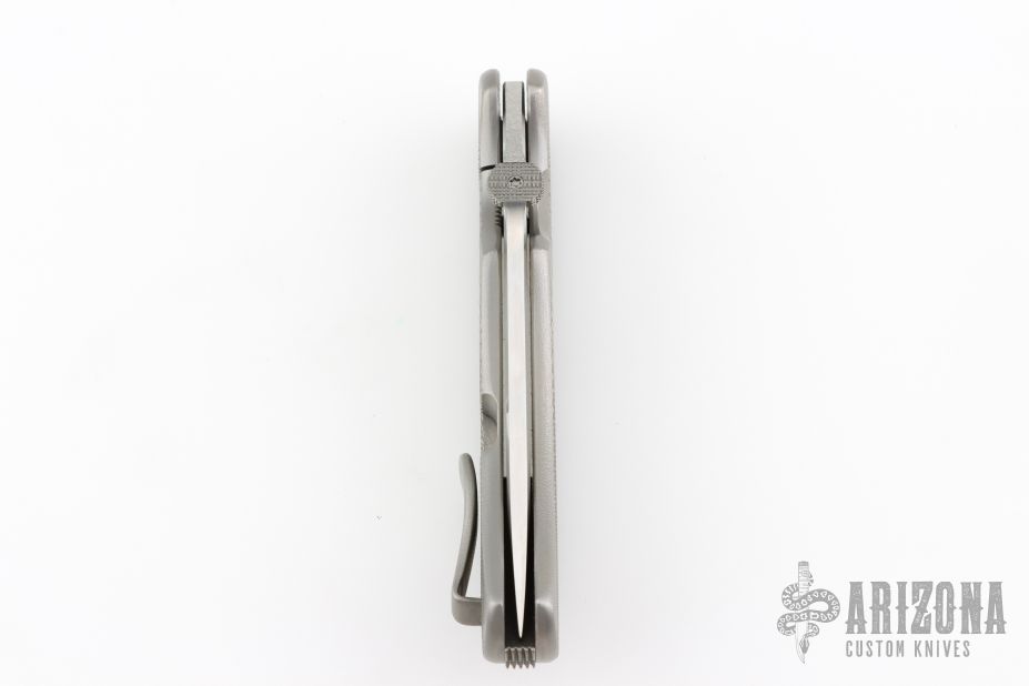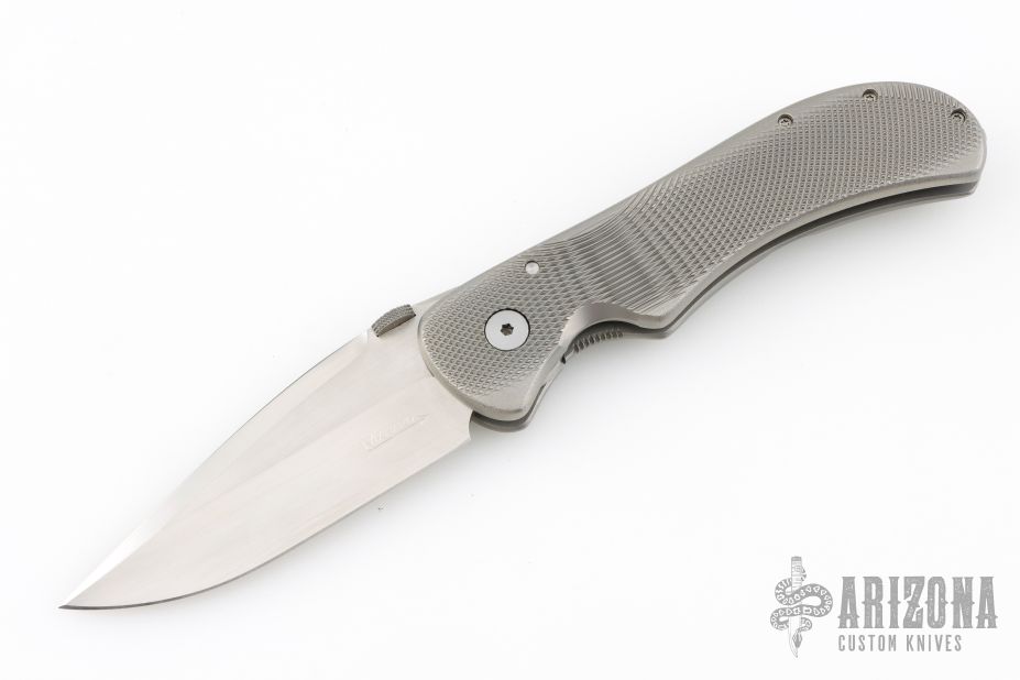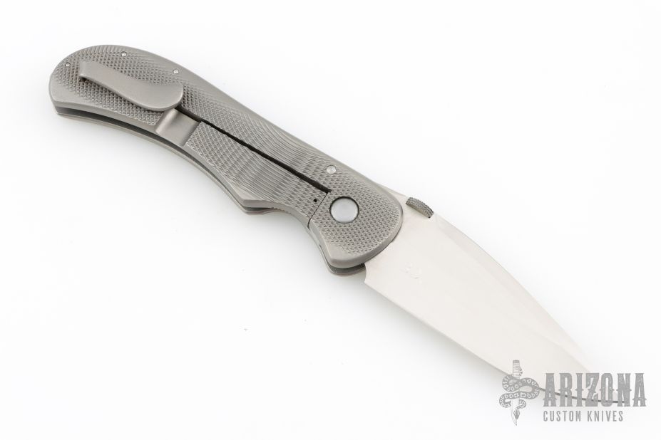 This Major by Sal Manaro features a hand rubbed satin finish blade with a notched thumbrest and a checkered titanium thumbdisc. Orange peeled and milled titanium frame with an orange peel finished titanium tip up clip and checkered titanium backspacer. Strong lock up, nice detent, perfect blade seating. The blade on this piece is BDC, or Boye Dentritic Cobalt, which is a super-performing, non-rusting cobalt-based alloy that is very similar to Stellite 6K. Knife is in excellent condition and has seen no use/carry. Comes in a Pena zippered case.
