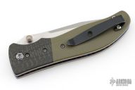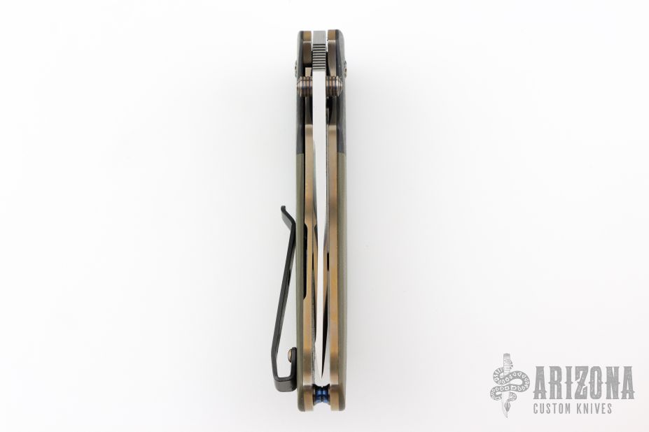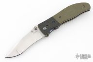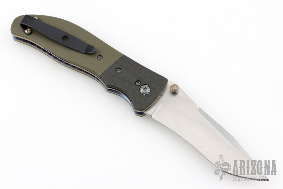 This Incinerator from Kirby Lambert features a satin-finished compound frindrecurve blade with dual thumbstuds and a notched thumbrest. The handle has carbon fiber bolsters, green G-10 scales, and a black tip up clip. Smooth action. Nice blade seating, detent, and lockup. Comes in a zipper case. Has a couple marks on the clip and blade. Great condition otherwise.