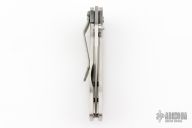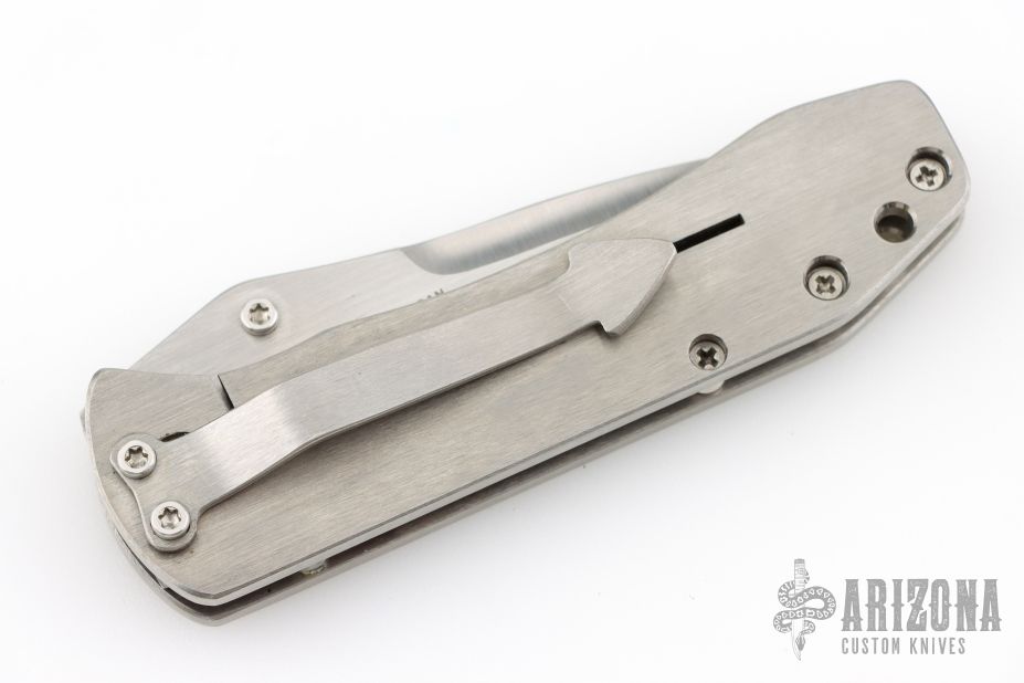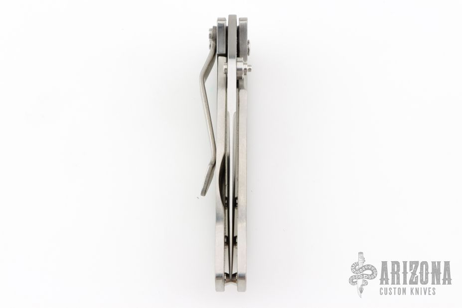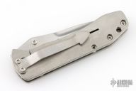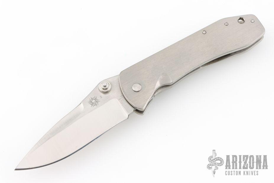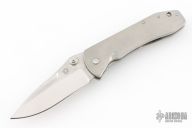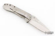 This Mini Whiplash framelock folder by Brad Duncan features a spear point blade with swedge and single thumbstud. The handle has satin finished titanium covers, barrel spacers, tip down titanium clip. Smooth action with a nice detent, lockup and blade seating. #2 on the blade. Has a few light scuffs and scratches, excellent condition otherwise.