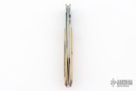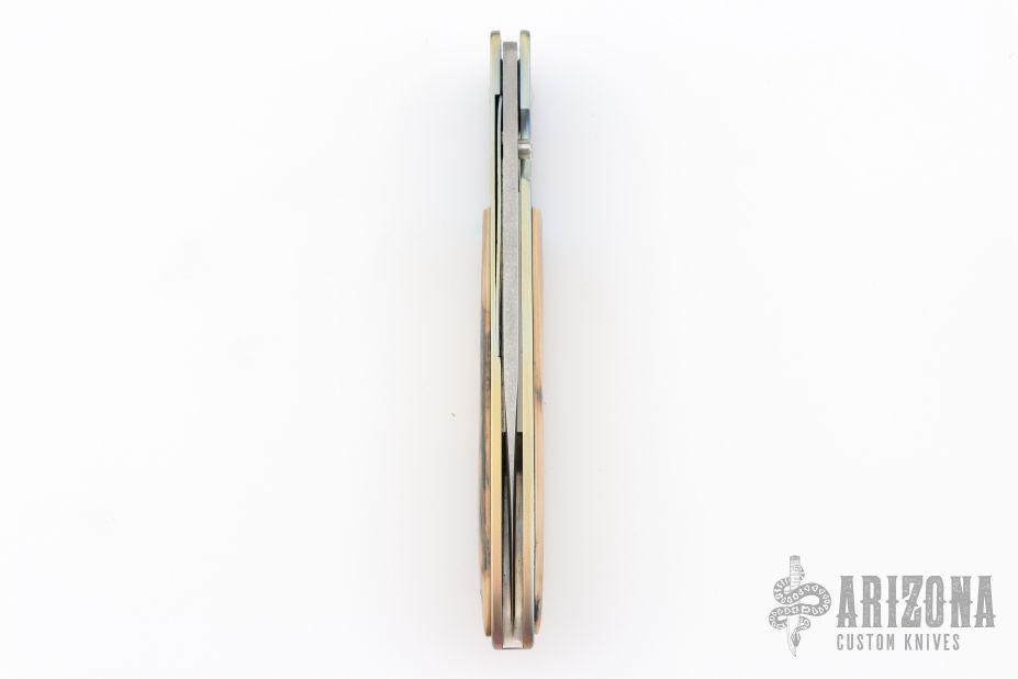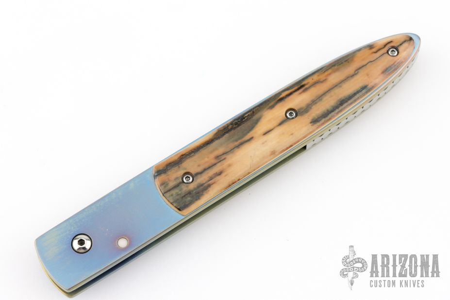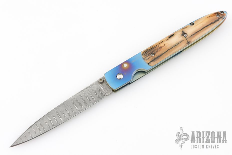 This knife by Crawford Knives features a spear point Damascus blade with false top edge and single thumbstud. The handle has an orange peel and anodize finish titanium frame, titanium liner, mammoth ivory overlays, file-worked stainless steel backspacer. Comes in a zipper case with soft pouch. Has some scuffs and scratches, great overall condition.