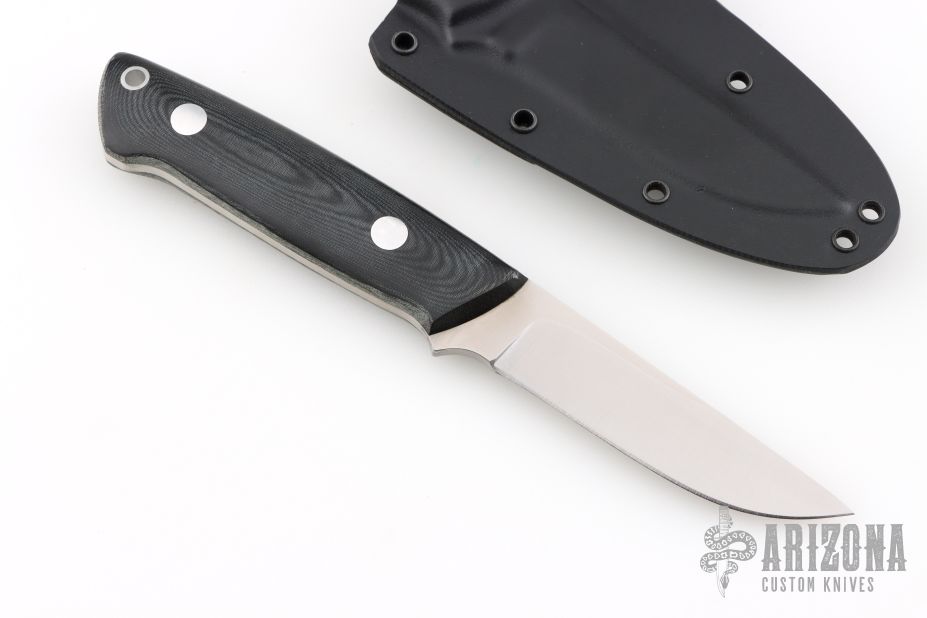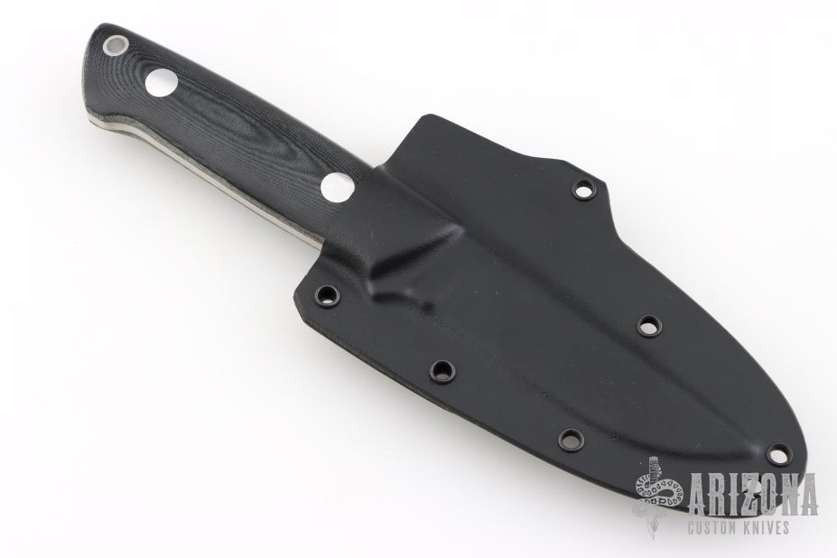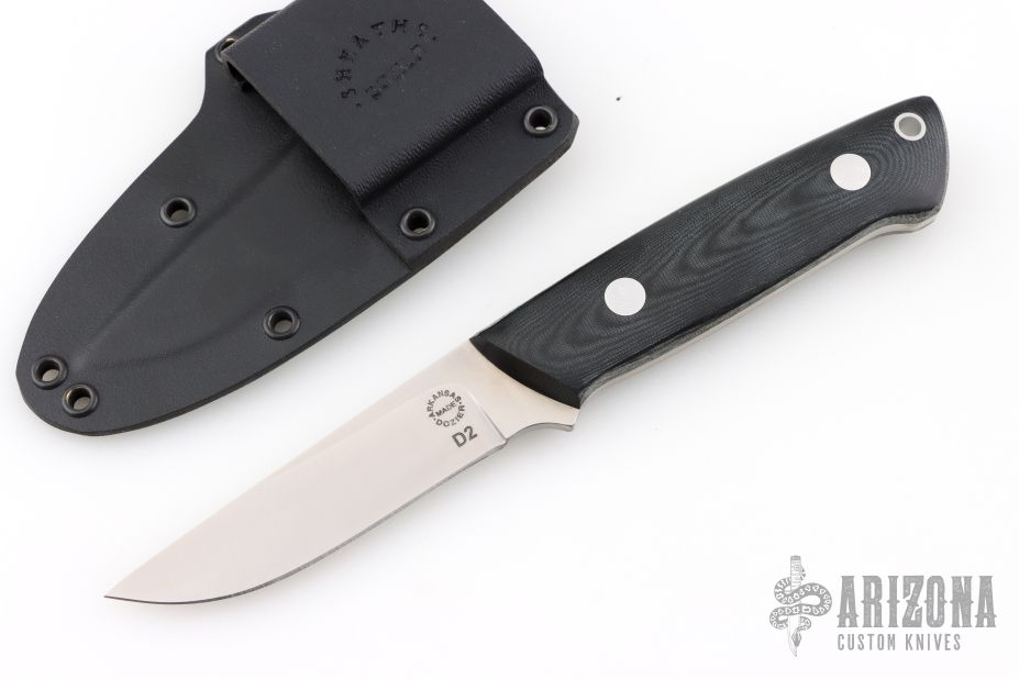This K-7 Slim Outdoorsman by Dozier Knives features a satin finished blade, .138" blade stock and .842" blade depth, full tang construction. The handle has black linen micarta scales with aluminum pins and lanyard hole. Comes with kydex sheath with belt clip. New from maker!