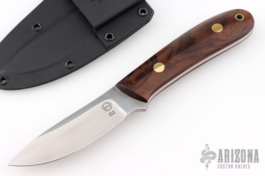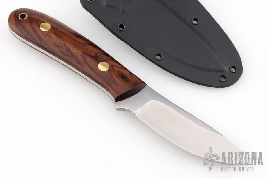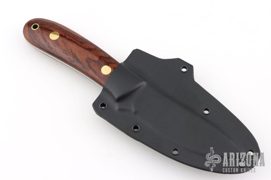 This K-16 Yukon Pro Skinner by Dozier Knives features a satin finished blade with .129" blade stock and 1.047" blade depth, full tang construction. The handle has cocobolo scales with brass pins and lanyard hole. Comes with kydex sheath with belt clip. New from maker.