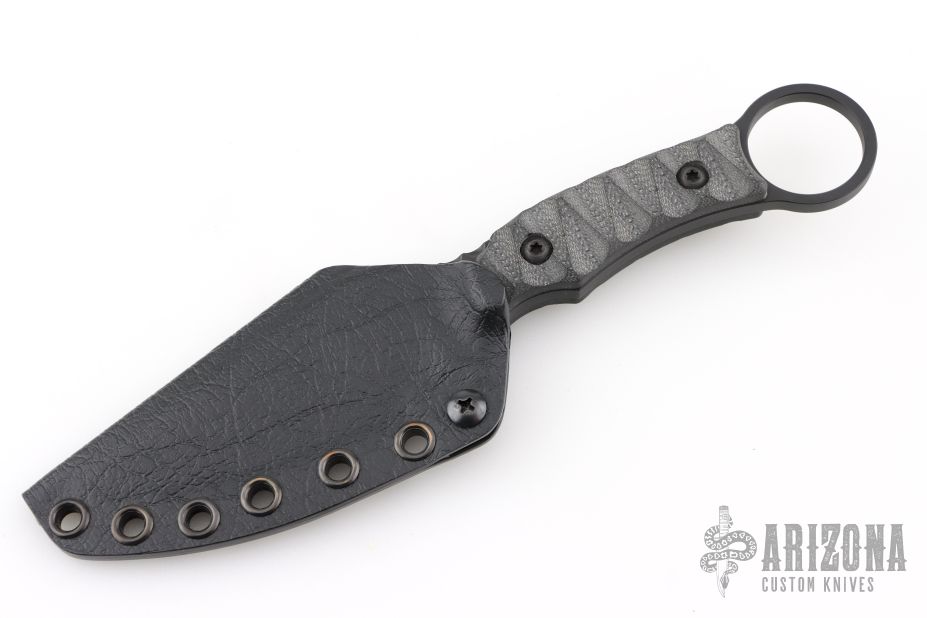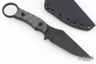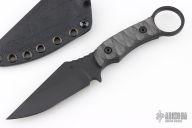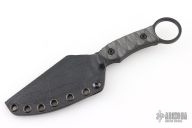 This Vandal by Toor Knives features a black gunkote blade with notched thumbrest, .192" blade stock and 1.387" blade depth, full tang construction. The handle has dynamic patterned black G-10 scales with ring at the butt. Comes with a kydex sheath. Has a couple light sheath scuffs, otherwise excellent condition.