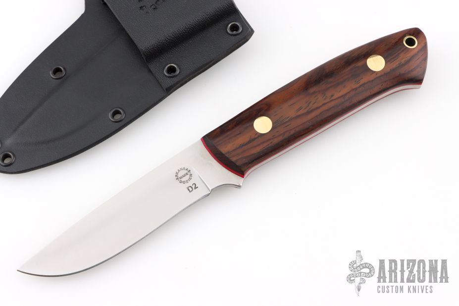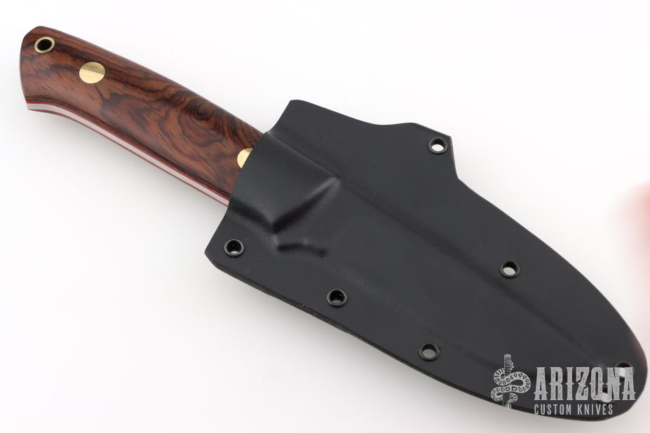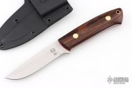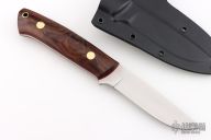This K-22 Buffalo River Hunter by Dozier Knives features a satin finished blade, .129" blade stock and .911" blade depth, full tang construction. The handle has cocobolo scales with brass pins and lanyard hole. Comes with kydex sheath with belt clip. New from maker.