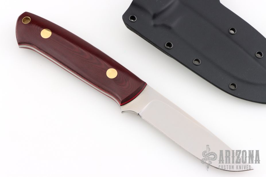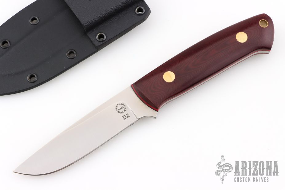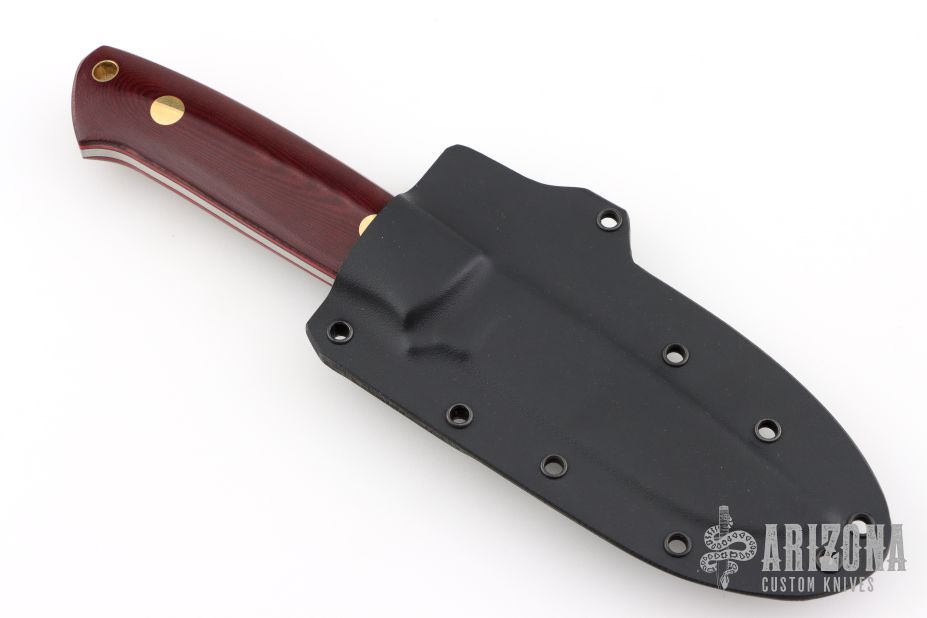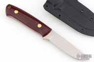 This K-22 Buffalo River Hunter by Dozier Knives features a satin finished blade, .129" blade stock and .911" blade depth, full tang construction. The handle has burgundy micarta scales with brass pins and lanyard hole. Comes with kydex sheath with belt clip. New from maker.