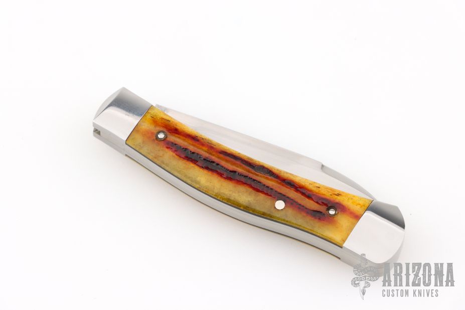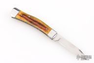 This Dogleg Pup by Michael Coker features a hand rub satin finished blade with nail nick. The handle has pinched and polished stainless steel bolsters with integral liners, Culpepper Jigged Bone covers with black liners, interior of liners are jeweled, stainless steel spring with half-stop, flush in all positions. Nice pull and blade seating. Comes with a zippered case. New from maker!