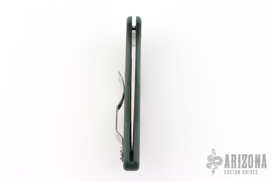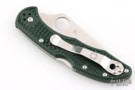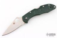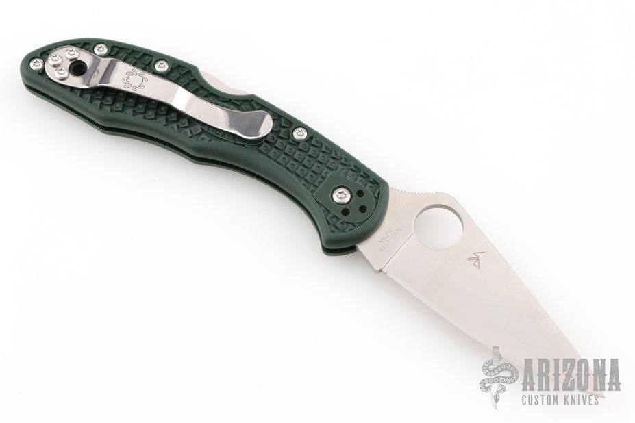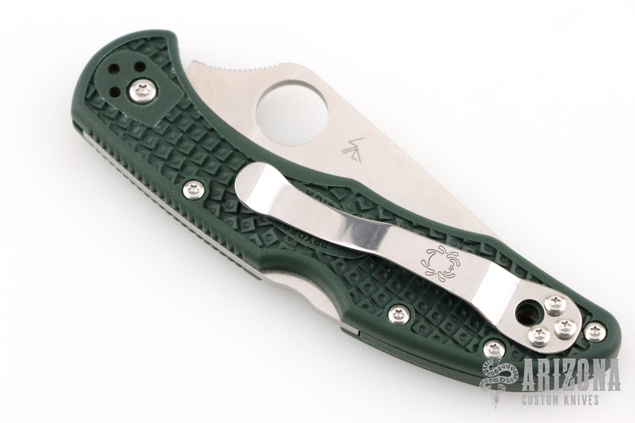 This knife by Spyderco has a satin finished blade with thumbhole opener and notched thumbrest. The handle has green FRN scales and a 4-way reversible stainless clip. Comes with original box and papers. Excellent condition.