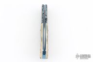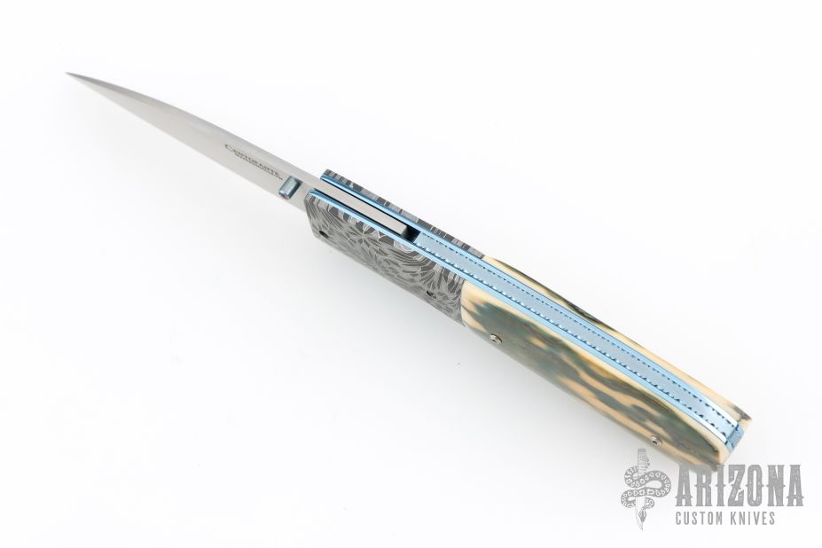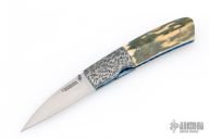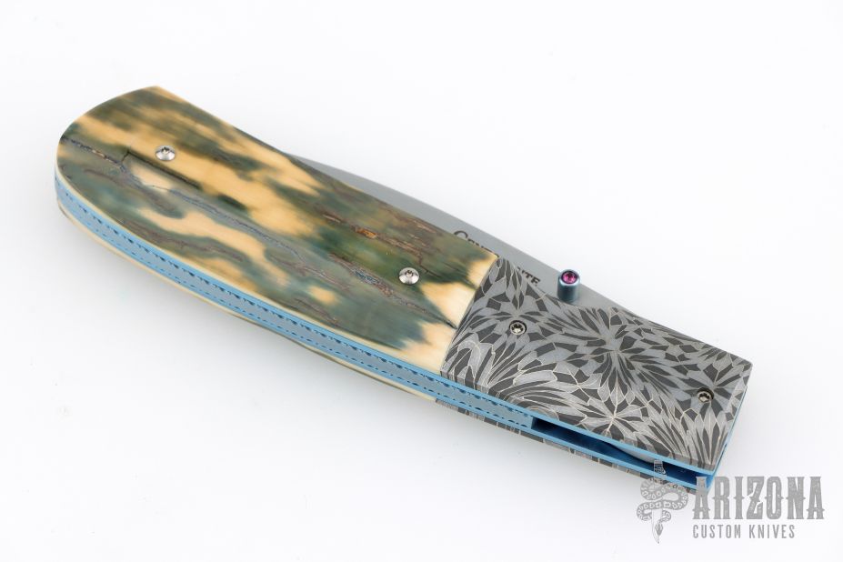 This knife by the late Frank Centofante features a hand rub satin finished blade with single thumb stud with red stone inlay. The handle has mosaic Damascus bolsters, mammoth ivory scales, anodized titanium liners with jeweled interiors, fileworked and anodized titanium backspacer. Nice detent, lockup and blade seating. Comes with a zippered case. Excellent condition.