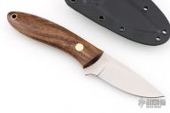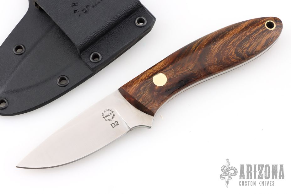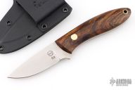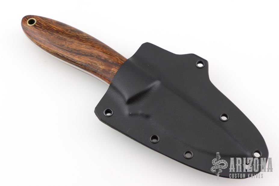 This K-58 Small Evo Hunter by Dozier Knives features a satin finished blade with .119" blade stock and .959" blade depth, full tang construction. The handle has desert ironwood scales, brass pins and lanyard hole. Comes with kydex sheath with belt clip. New from maker.