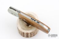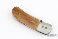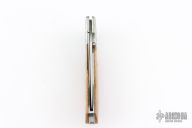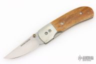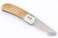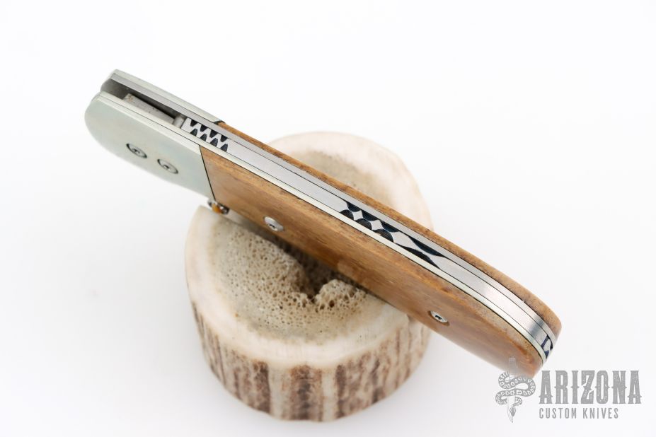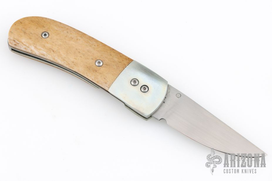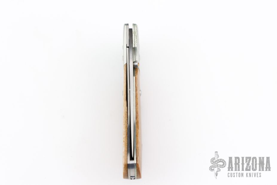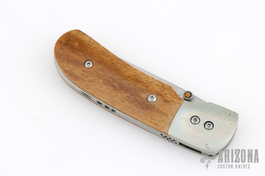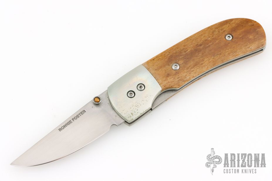 This knife by Ronnie Foster features a hand rub satin finished drop point blade with a single thumb stud with inlay. The handle has nickel silver bolsters, bone covers, titanium liners, and file worked backstrap. Nice detent, lockup and blade seating. Has some scuffs, scratches, and patina. Great condition otherwise.