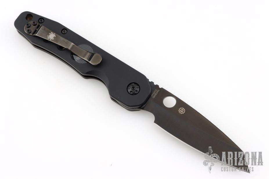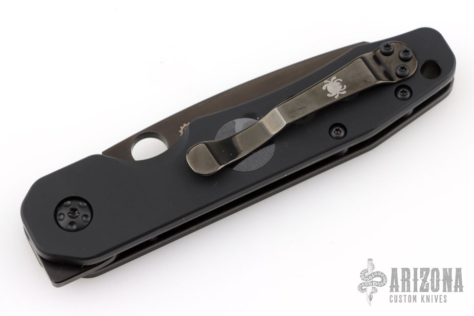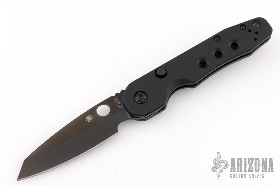 This Smock by Spyderco has a black finish sheepsfoot style blade. The handle features black aluminum scales over stainless steel liners with a reversible tip up pocket clip. Comes with original box and papers. Excellent condition.