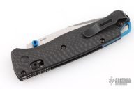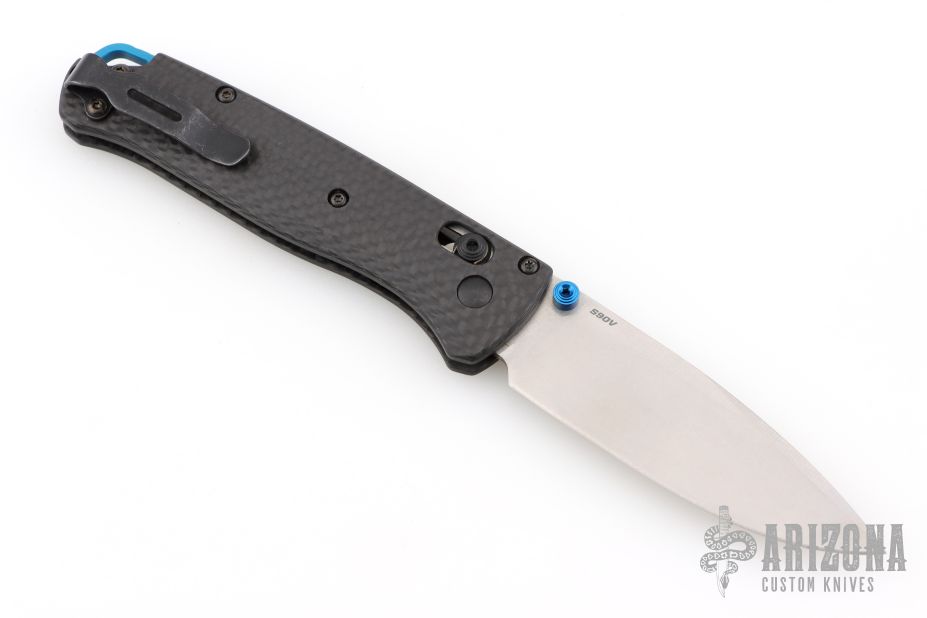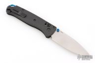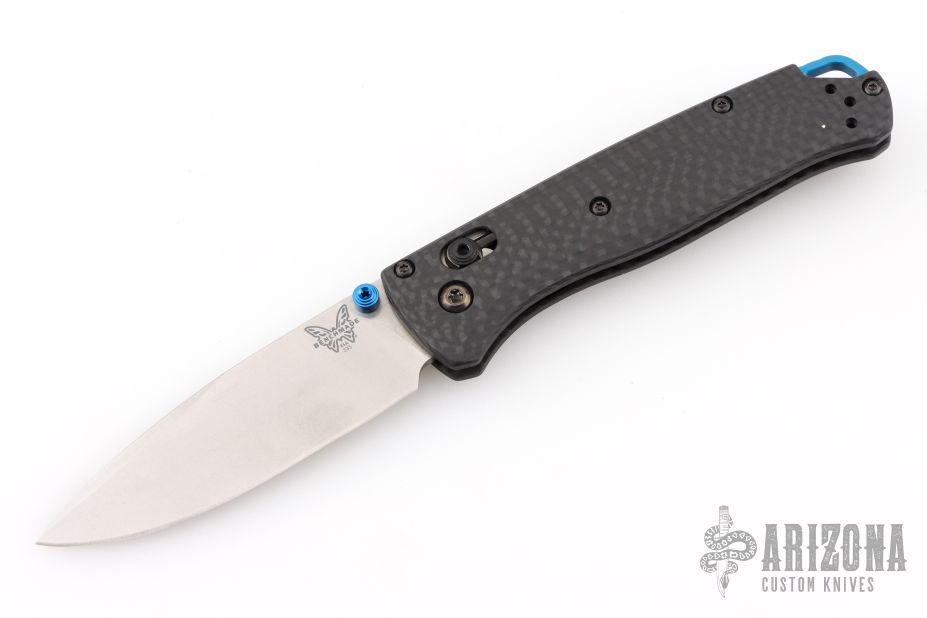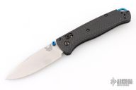 The 535-3 Bugout knife is built with a carbon fiber handle and a satin finished blade with a plain cutting edge.