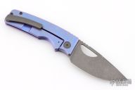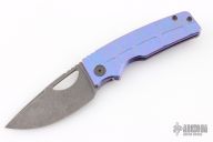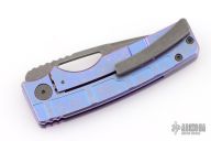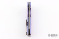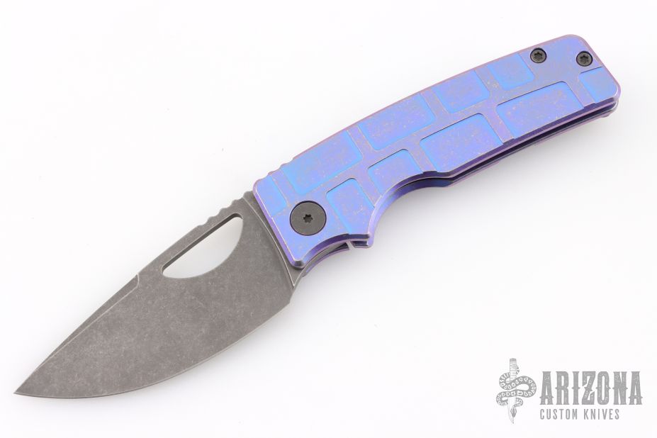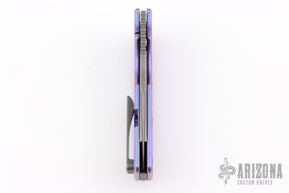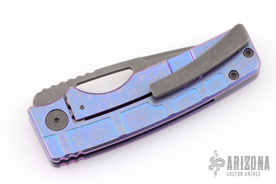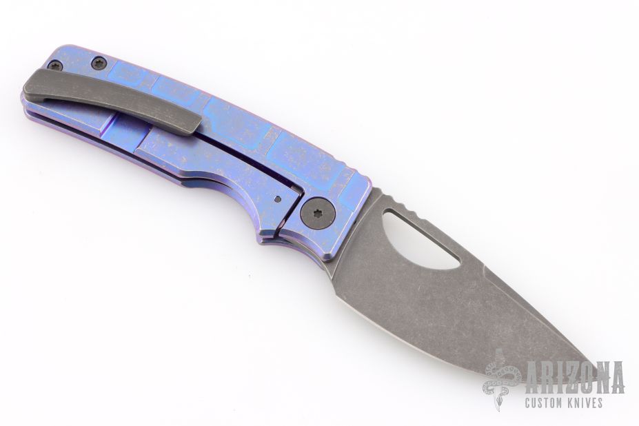 This knife by the OZ Machine Company features an acid wash/tumbled blade with thumbhole and notched thumbrest. The handle features a milled, anodized and tumbled titanium frame with a distressed titanium backspacer and matching tip up clip with hidden screws. Comes with original box, and card dated 10-28-24. Excellent condition.